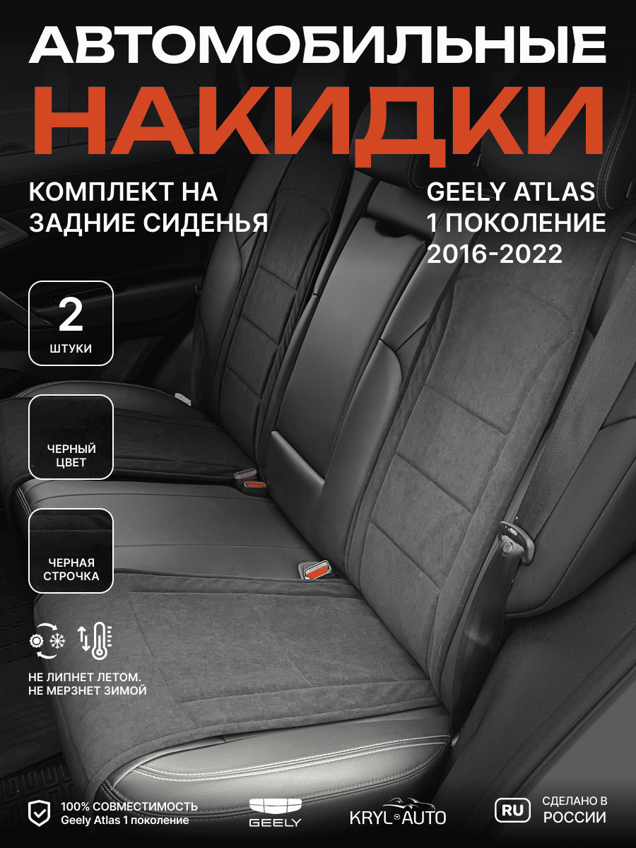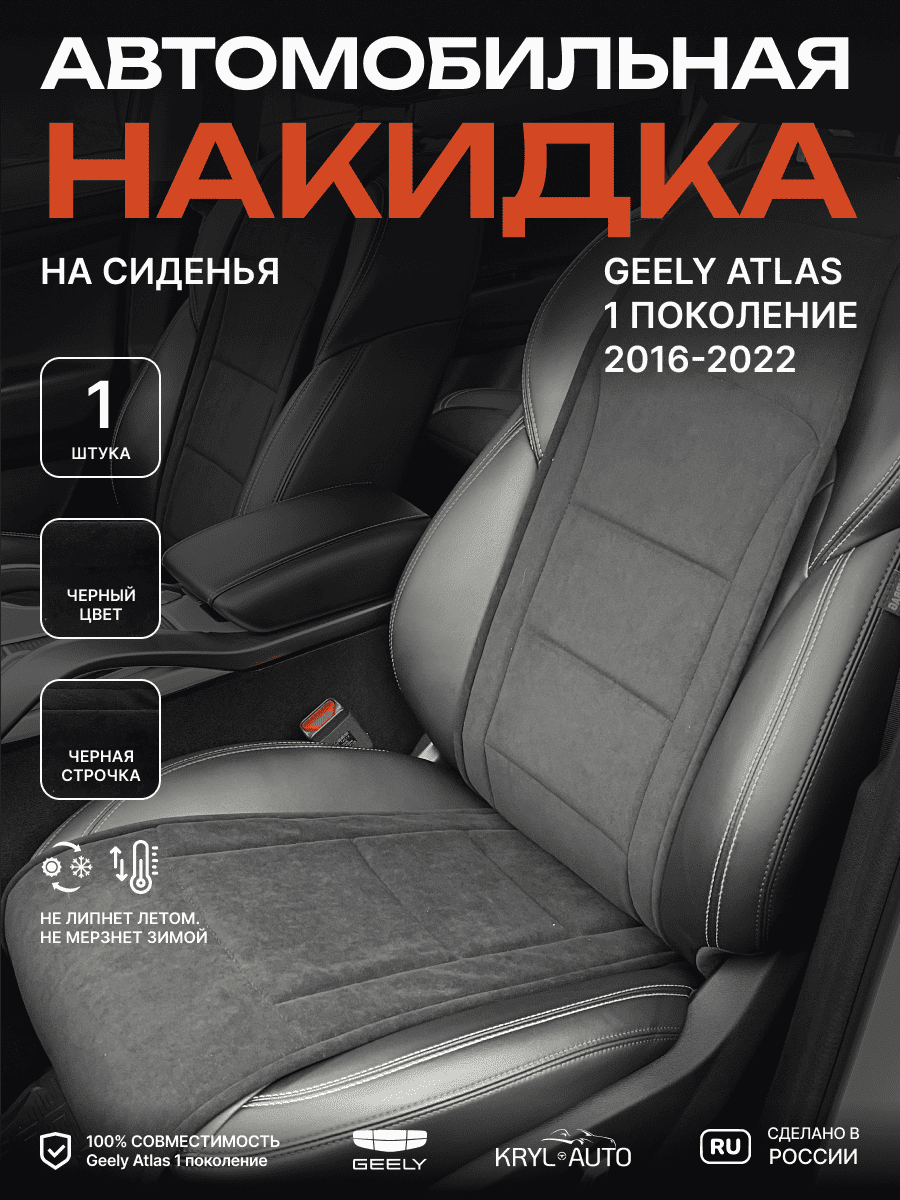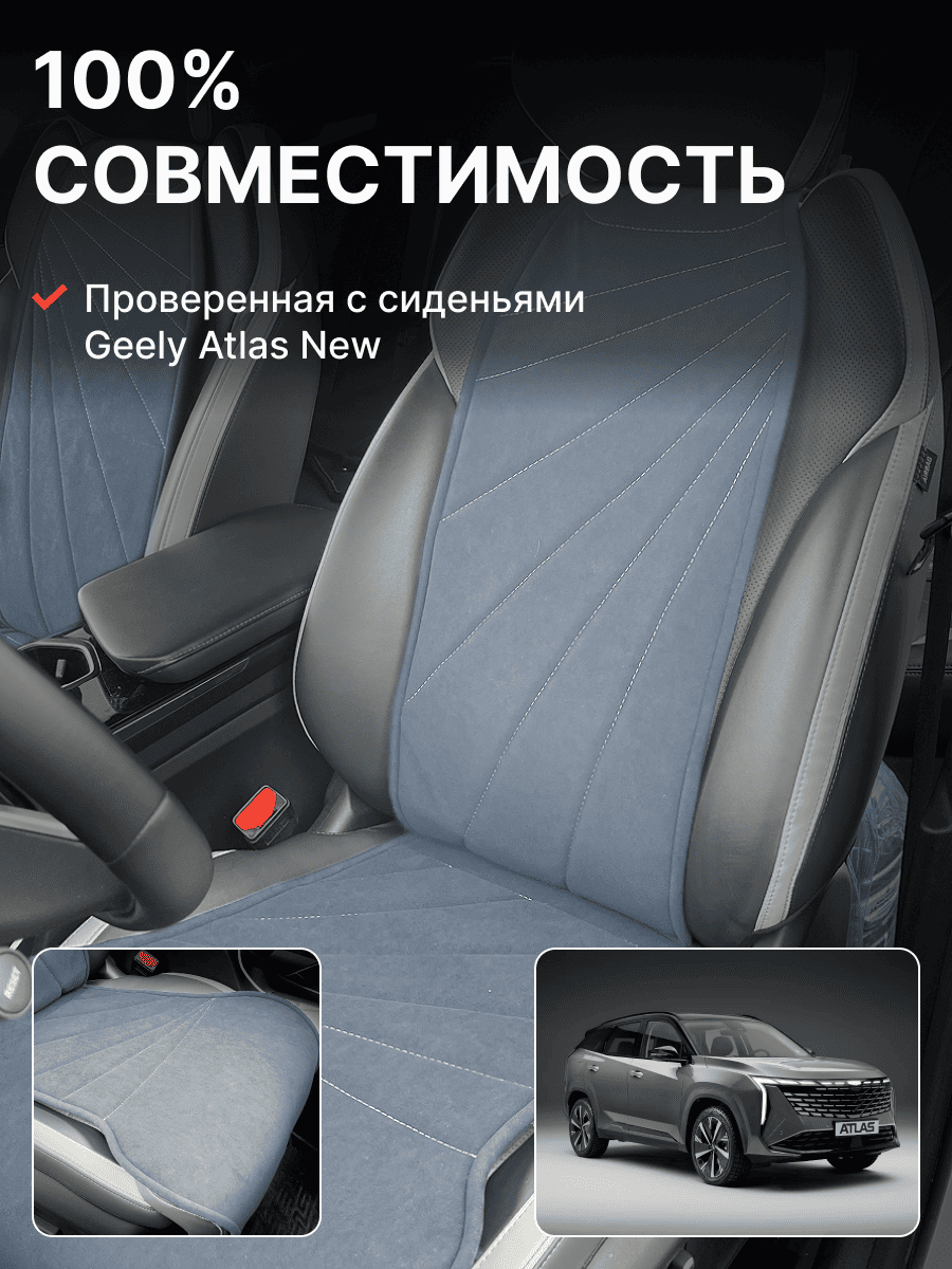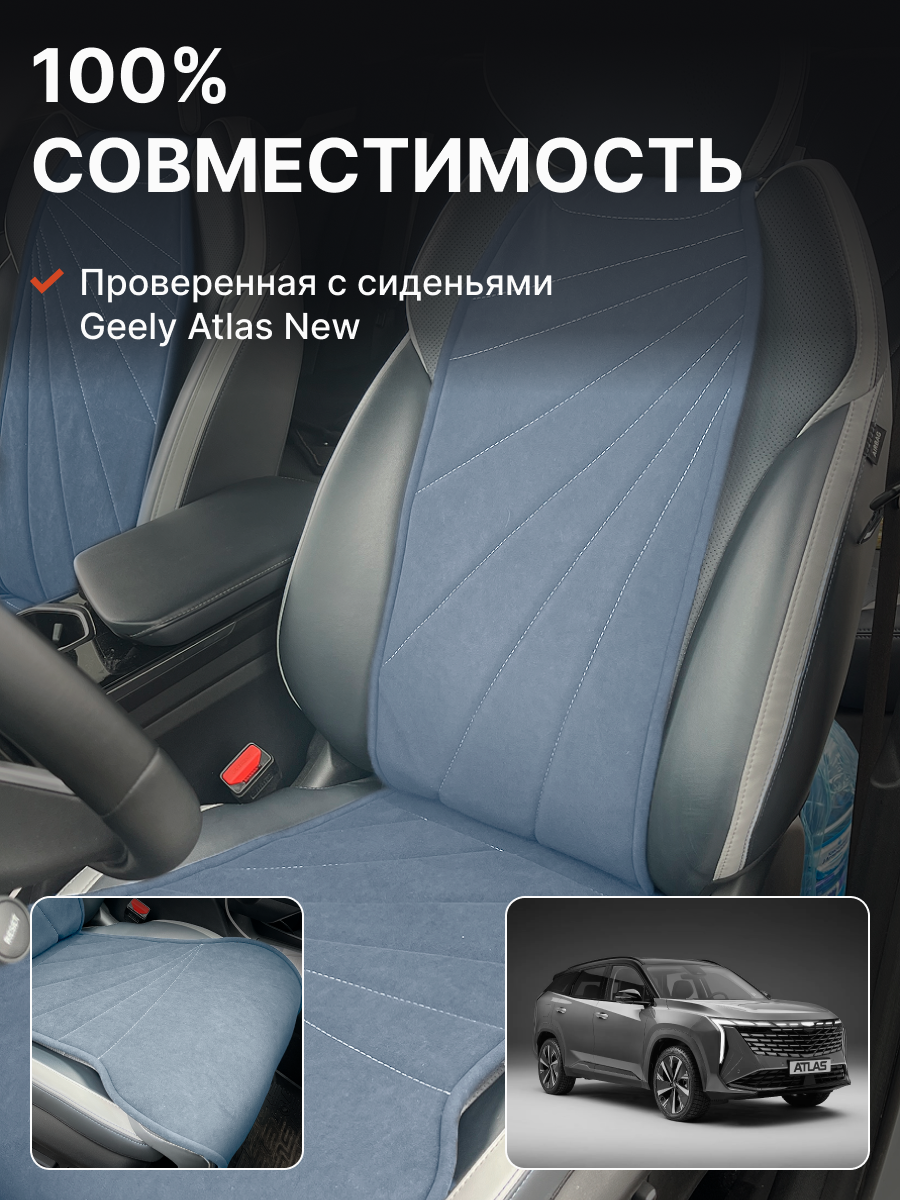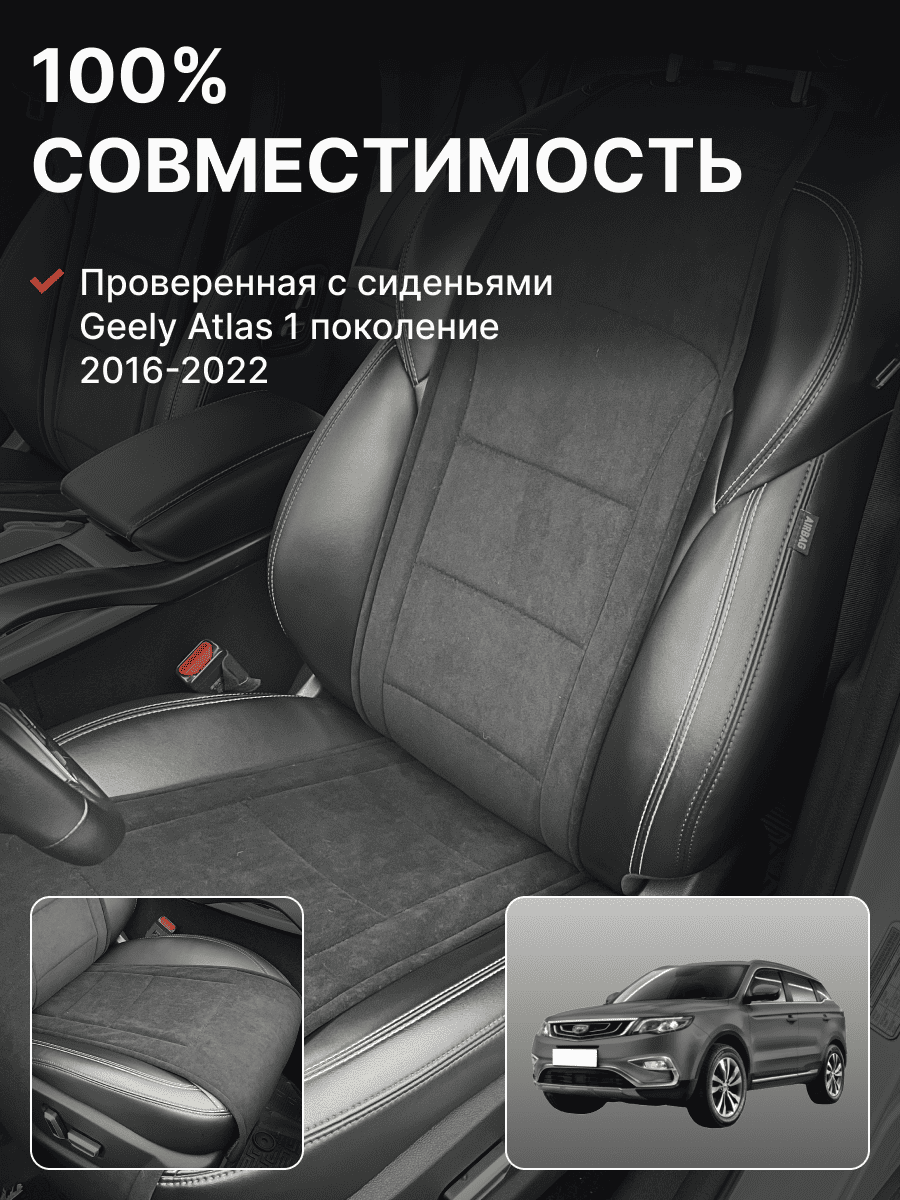 Совместимость: подходит для Geely Atlas 1 поколение (2016-2022). Материал: микровелюр — мягкий, приятный на ощупь, легко чистится, не выгорает. Назначение: защита оригинальной обивки от загрязнений, износа, повреждений. Комфорт зимой и летом. Крепление: надежная фиксация без смещений, простая установка без инструментов. Безопасность: не мешает срабатыванию боковых подушек безопасности (Airbag). Дизайн: современный внешний вид, улучшает интерьер салона. Уход: легко чистится влажной салфеткой или пылесосом.