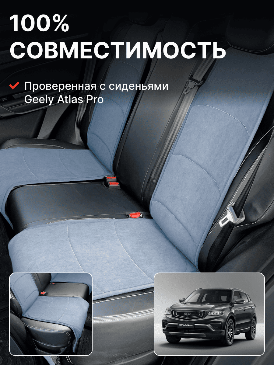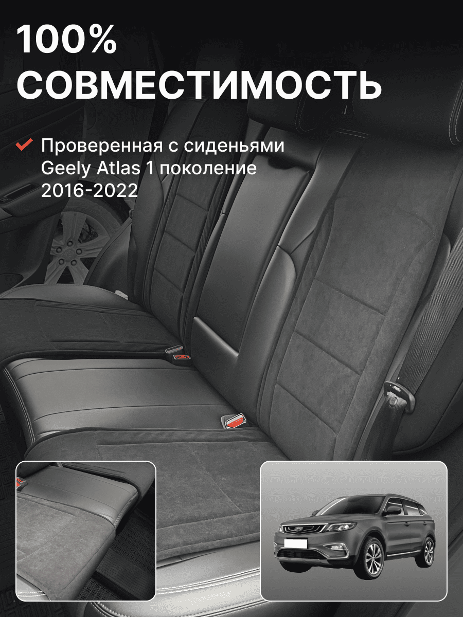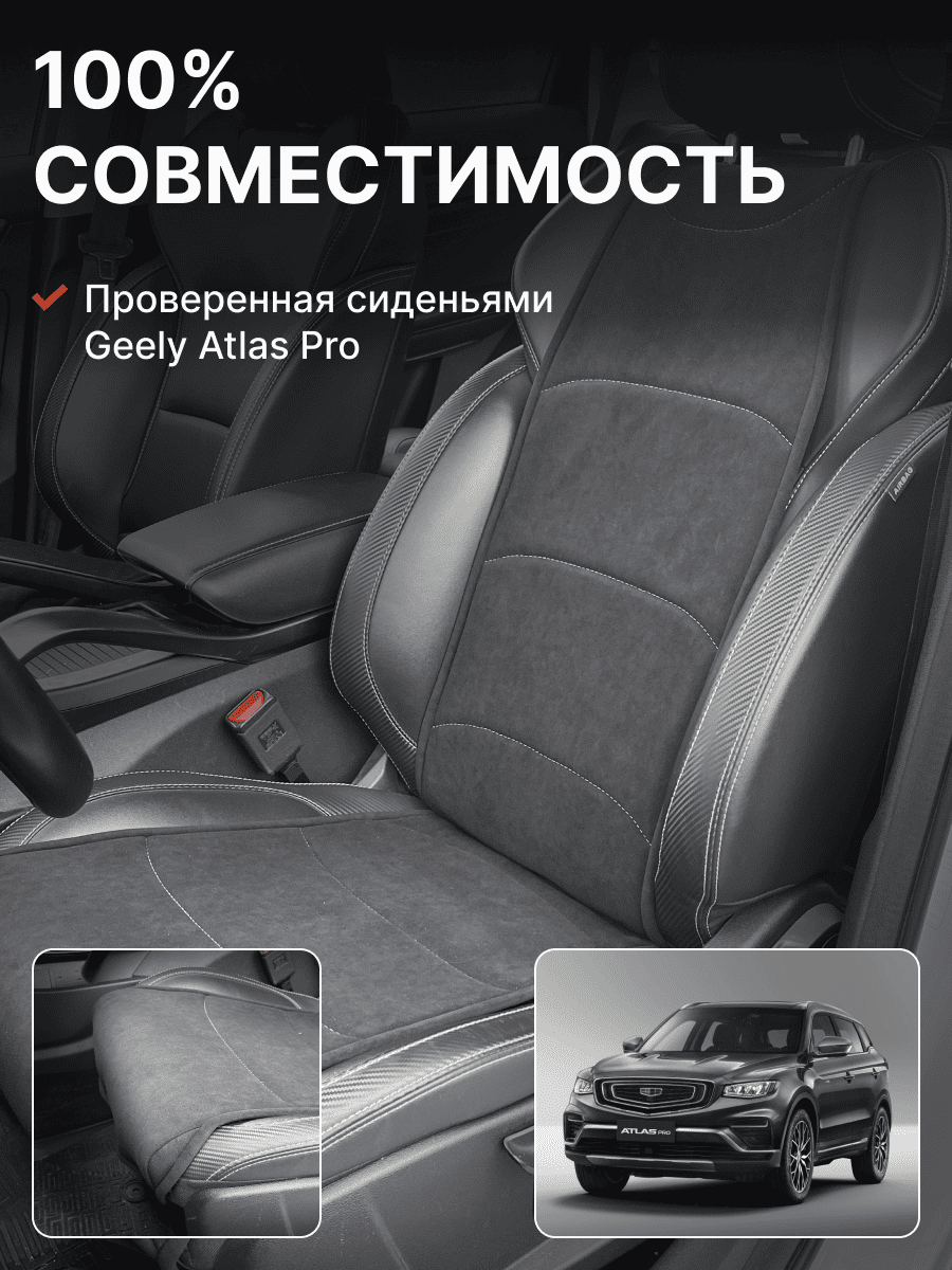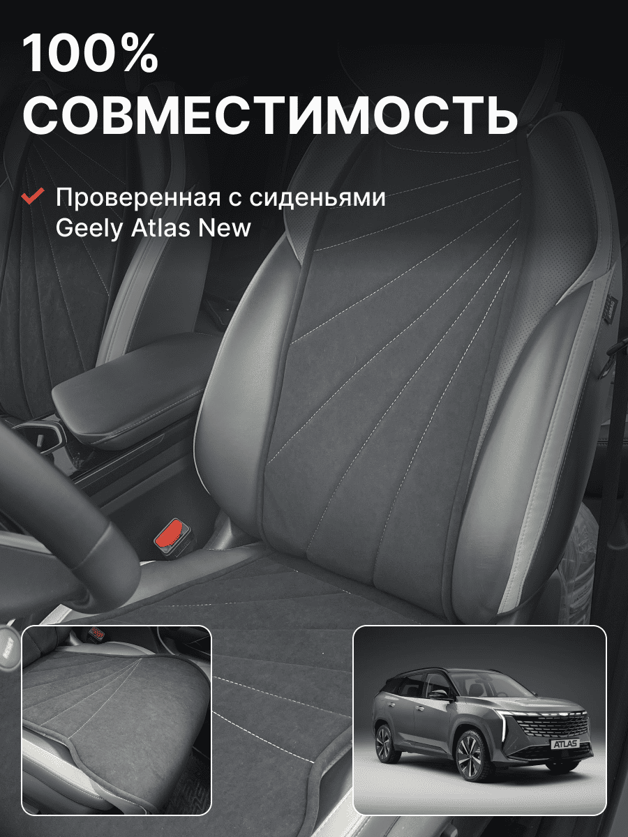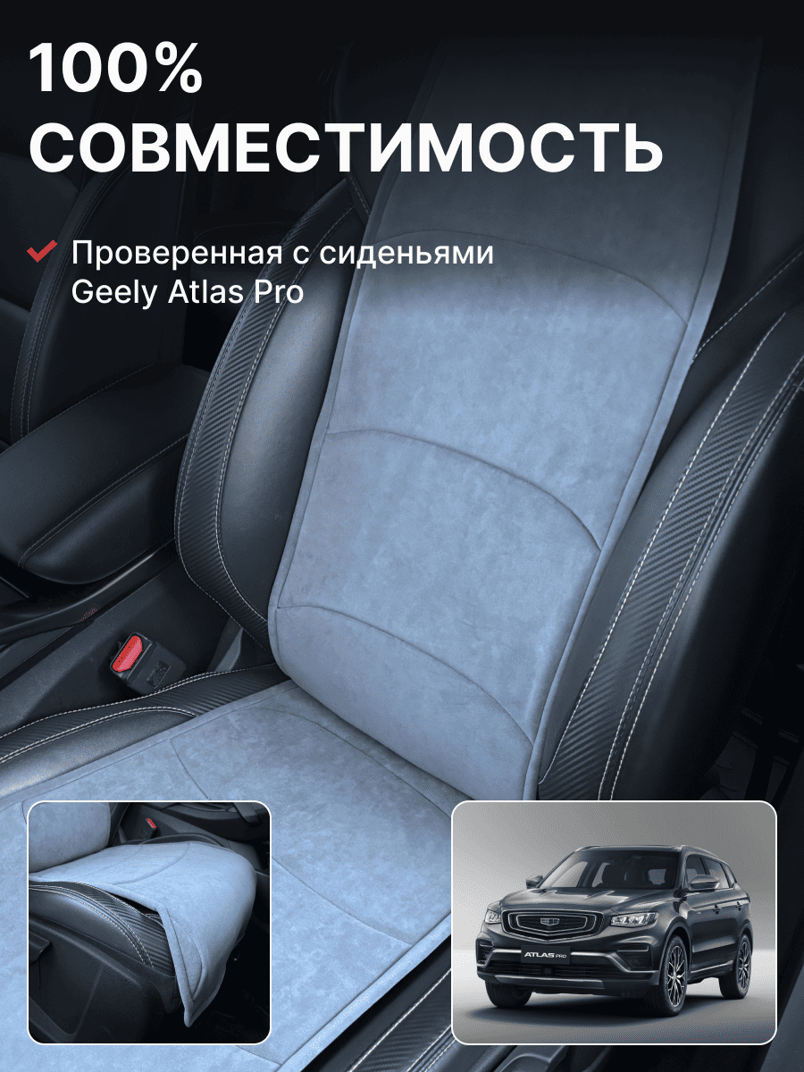 Совместимость: подходит для Geely Atlas 1 поколение (2016-2022). Материал: микровелюр — мягкий, приятный на ощупь, легко чистится, не выгорает. Назначение: защита оригинальной обивки от загрязнений, износа, повреждений. Комфорт зимой и летом. Крепление: надежная фиксация без смещений, простая установка без инструментов. Безопасность: не мешает срабатыванию боковых подушек безопасности (Airbag). Дизайн: современный внешний вид, улучшает интерьер салона. Уход: легко чистится влажной салфеткой или пылесосом.
