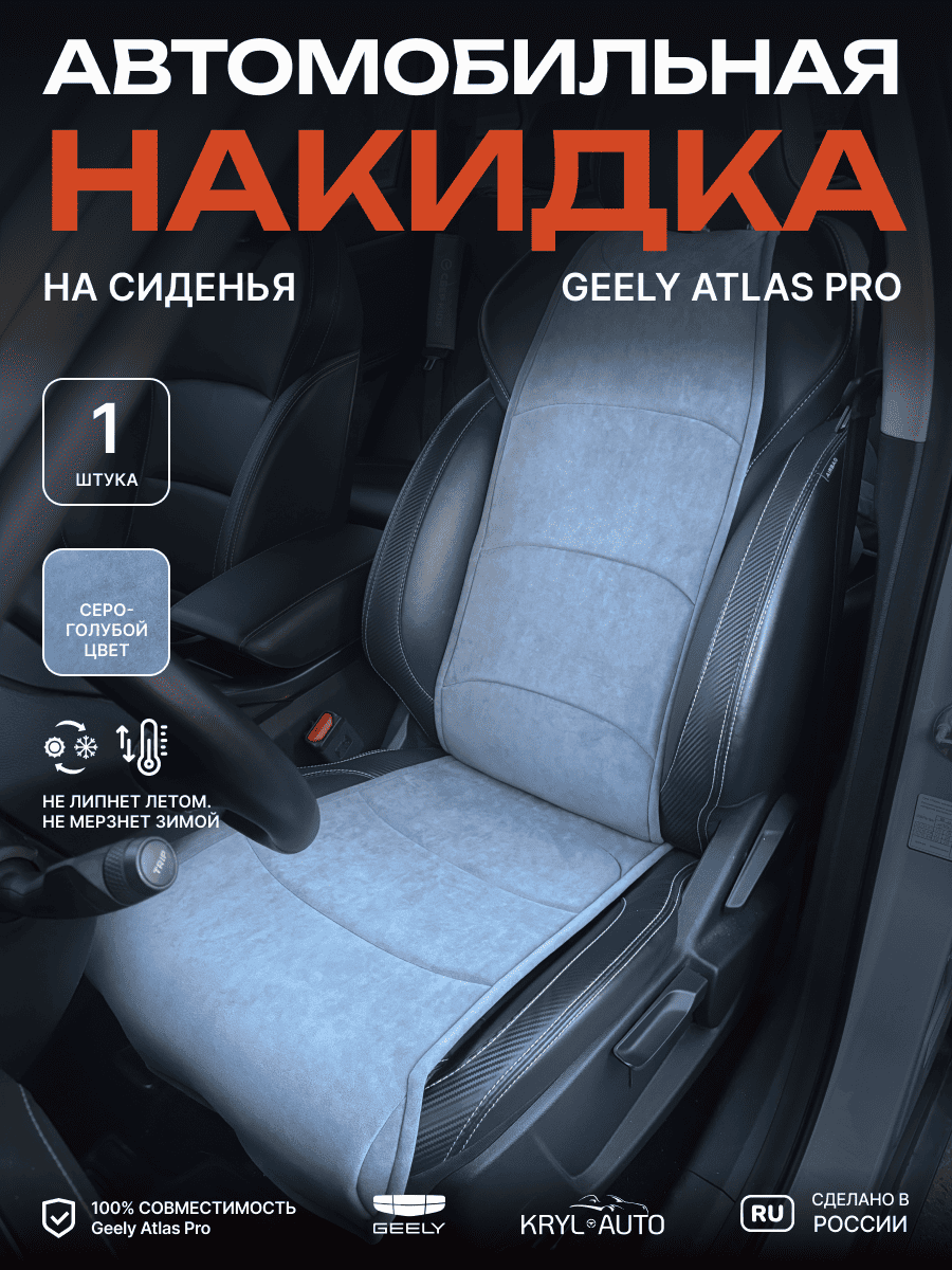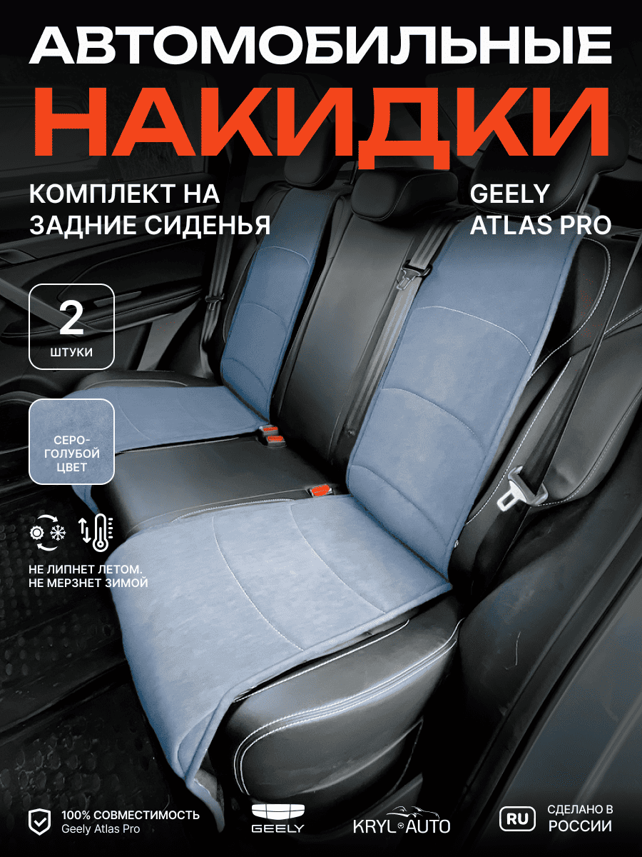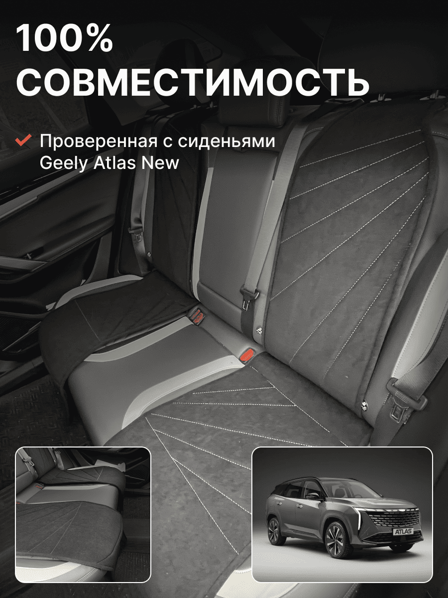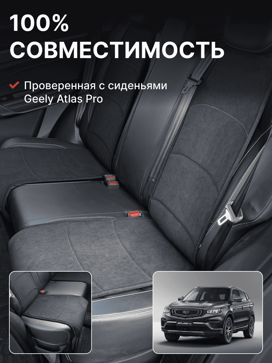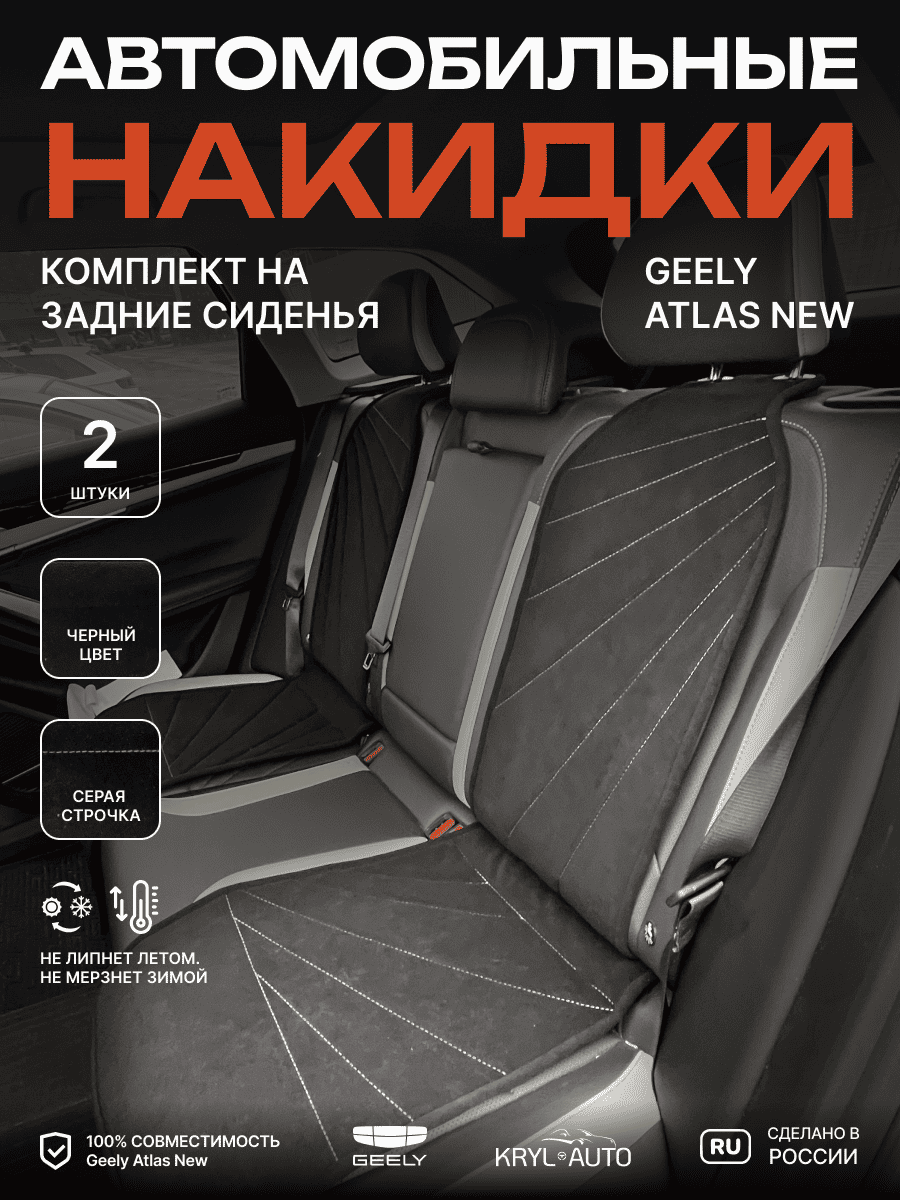 Совместимость: подходит для Geely Atlas 1 поколение (2016-2022). Материал: микровелюр — мягкий, приятный на ощупь, легко чистится, не выгорает. Назначение: защита оригинальной обивки от загрязнений, износа, повреждений. Комфорт зимой и летом. Крепление: надежная фиксация без смещений, простая установка без инструментов. Безопасность: не мешает срабатыванию боковых подушек безопасности (Airbag). Дизайн: современный внешний вид, улучшает интерьер салона. Уход: легко чистится влажной салфеткой или пылесосом.