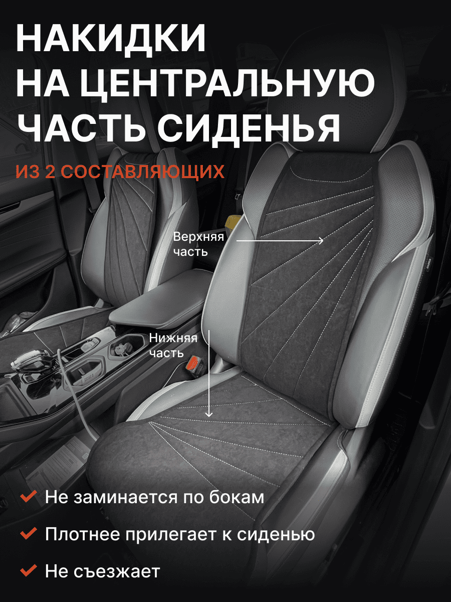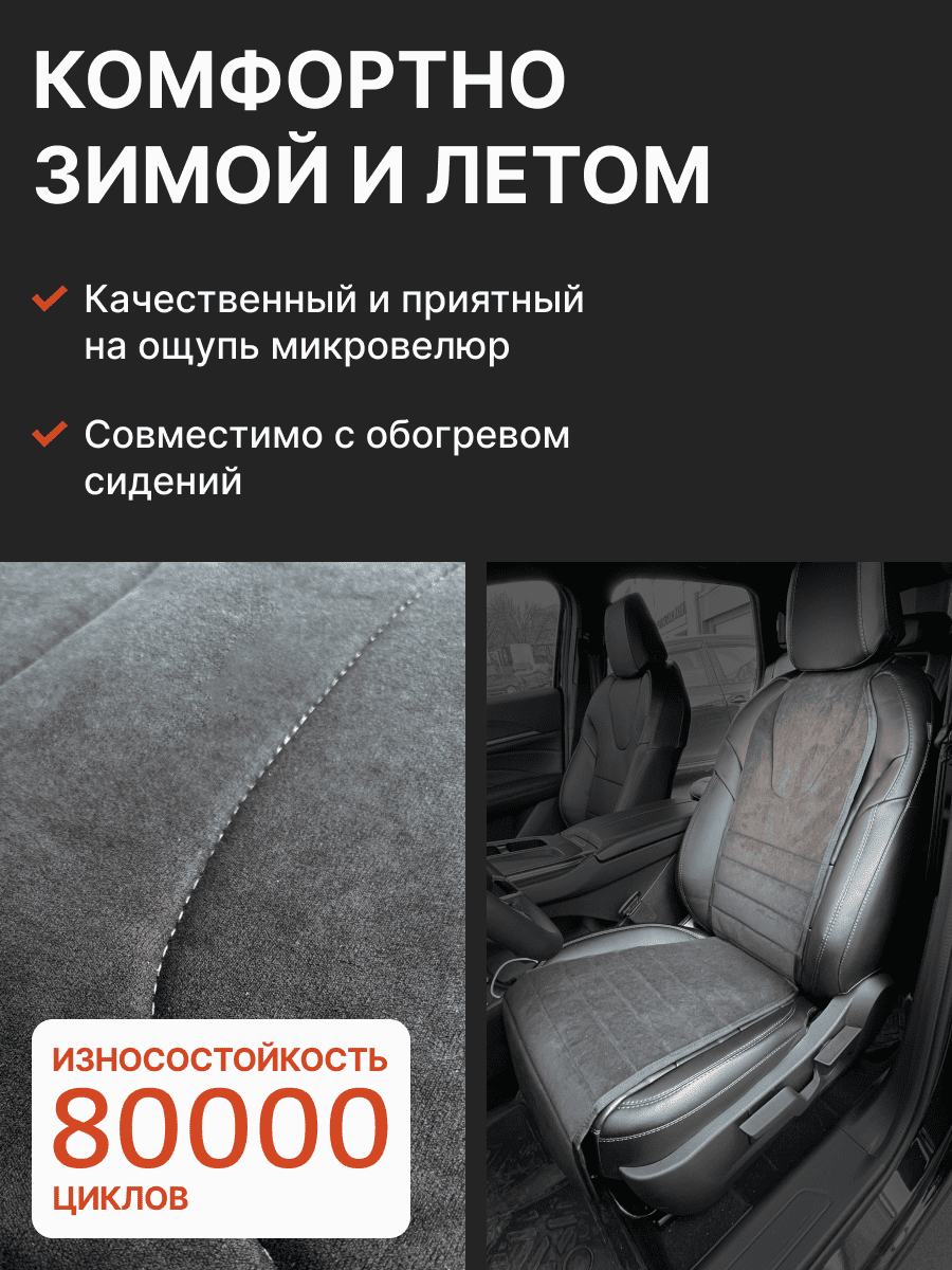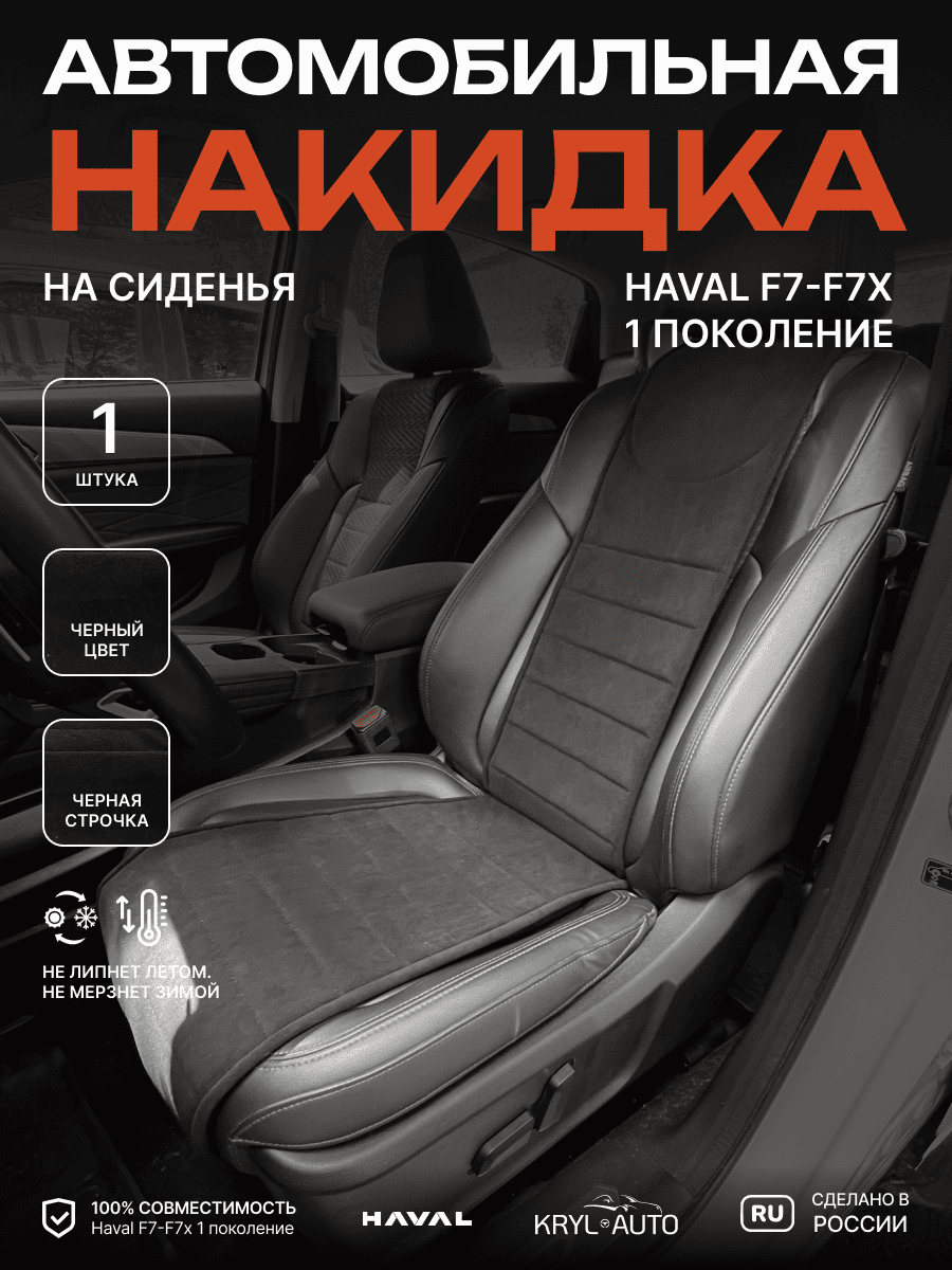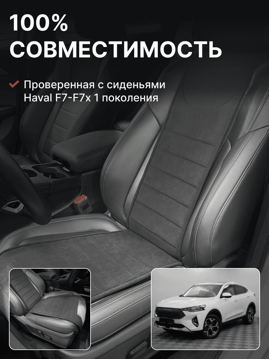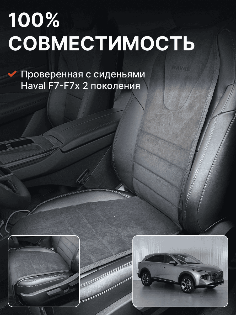 Совместимость: подходит для Haval F7/F7x (2 поколение) (2024, 2025). Материал: микровелюр — мягкий, приятный на ощупь, легко чистится, не выгорает. Назначение: защита оригинальной обивки от загрязнений, износа, повреждений. Комфорт зимой и летом. Крепление: надежная фиксация без смещений, простая установка без инструментов. Безопасность: не мешает срабатыванию боковых подушек безопасности (Airbag). Дизайн: современный внешний вид, улучшает интерьер салона. Уход: легко чистится влажной салфеткой или пылесосом.