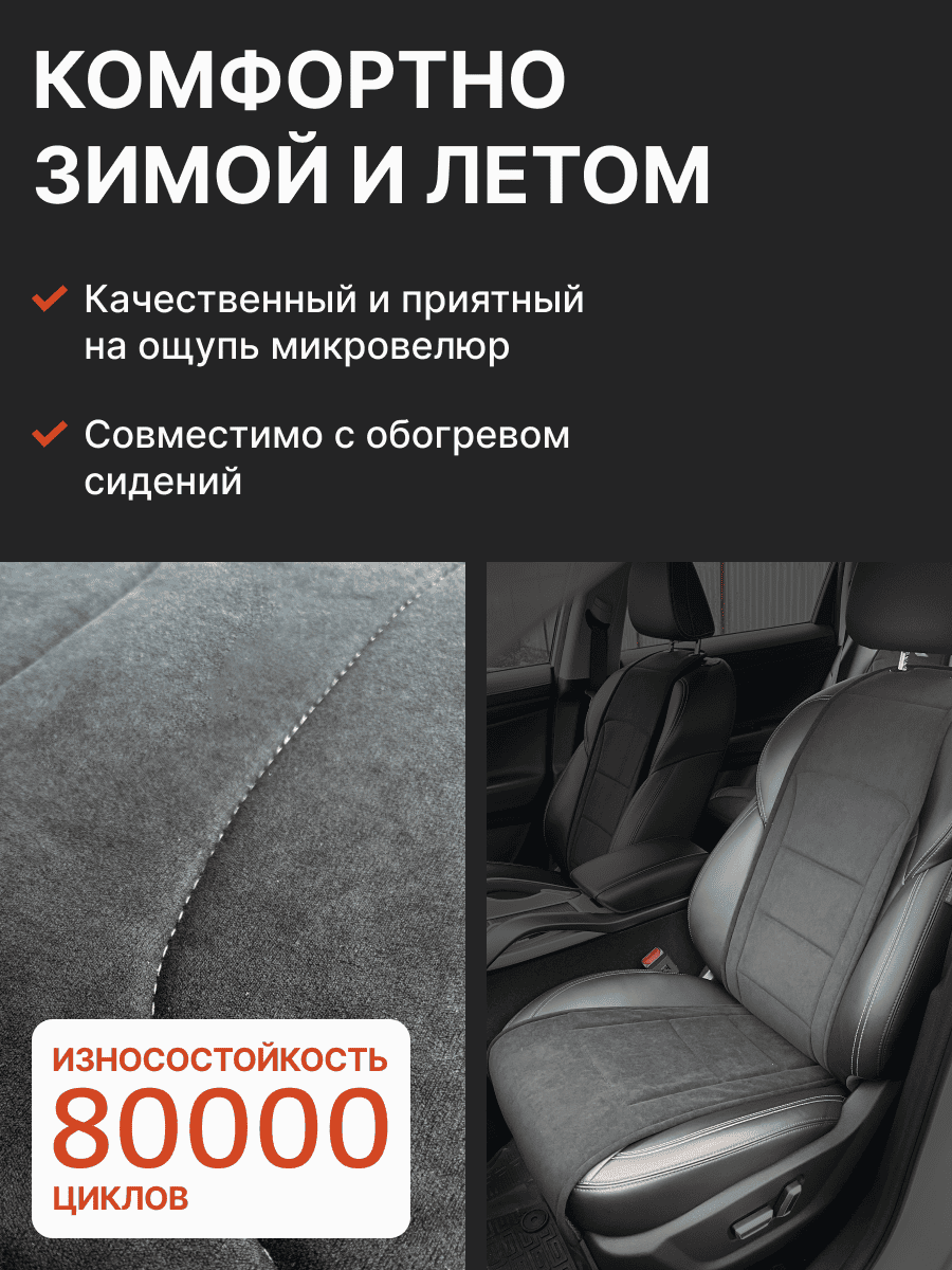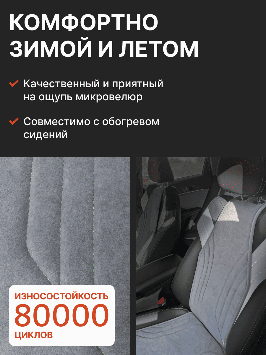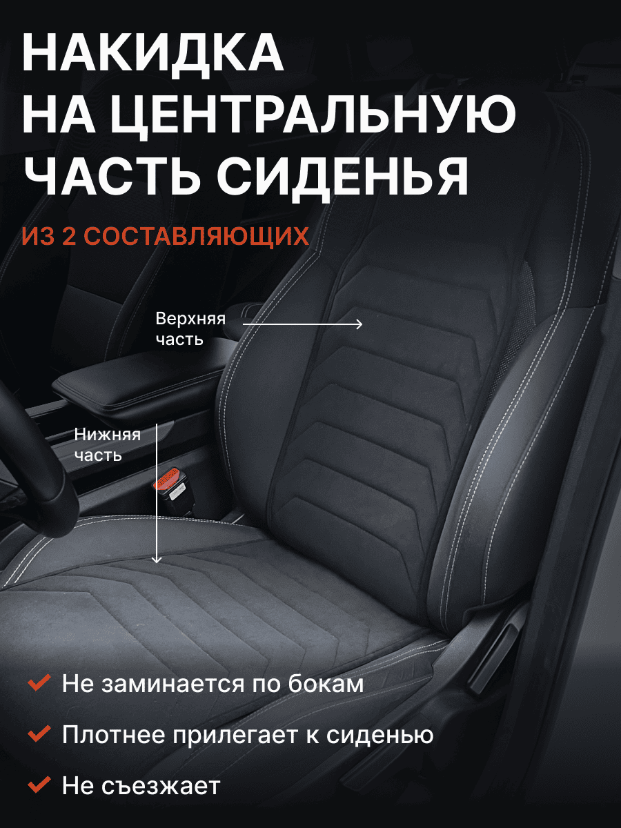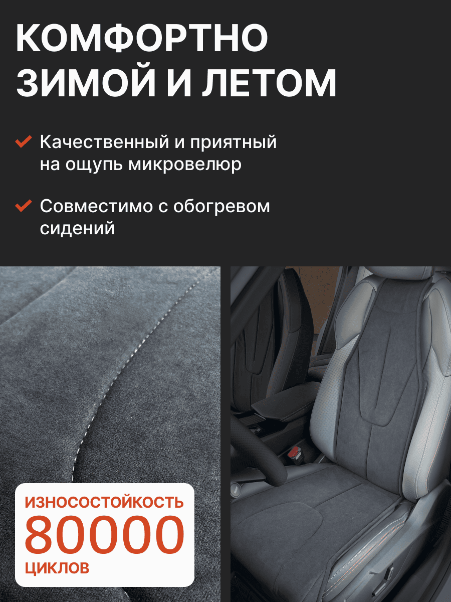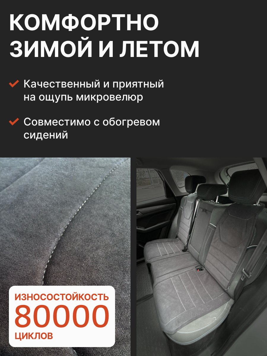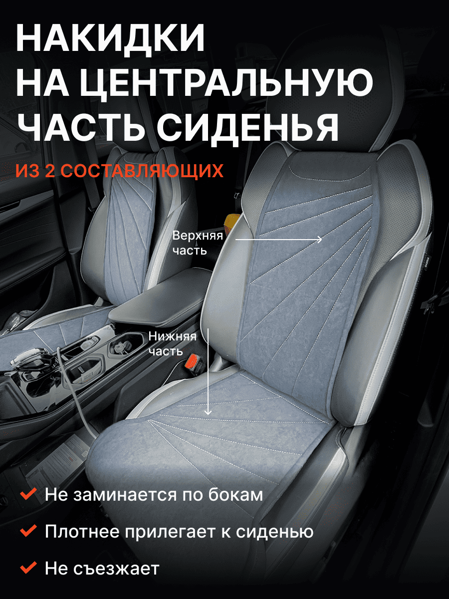 Совместимость: подходит для Haval F7/F7x (2 поколение) (2024, 2025). Материал: микровелюр — мягкий, приятный на ощупь, легко чистится, не выгорает. Назначение: защита оригинальной обивки от загрязнений, износа, повреждений. Комфорт зимой и летом. Крепление: надежная фиксация без смещений, простая установка без инструментов. Безопасность: не мешает срабатыванию боковых подушек безопасности (Airbag). Дизайн: современный внешний вид, улучшает интерьер салона. Уход: легко чистится влажной салфеткой или пылесосом.