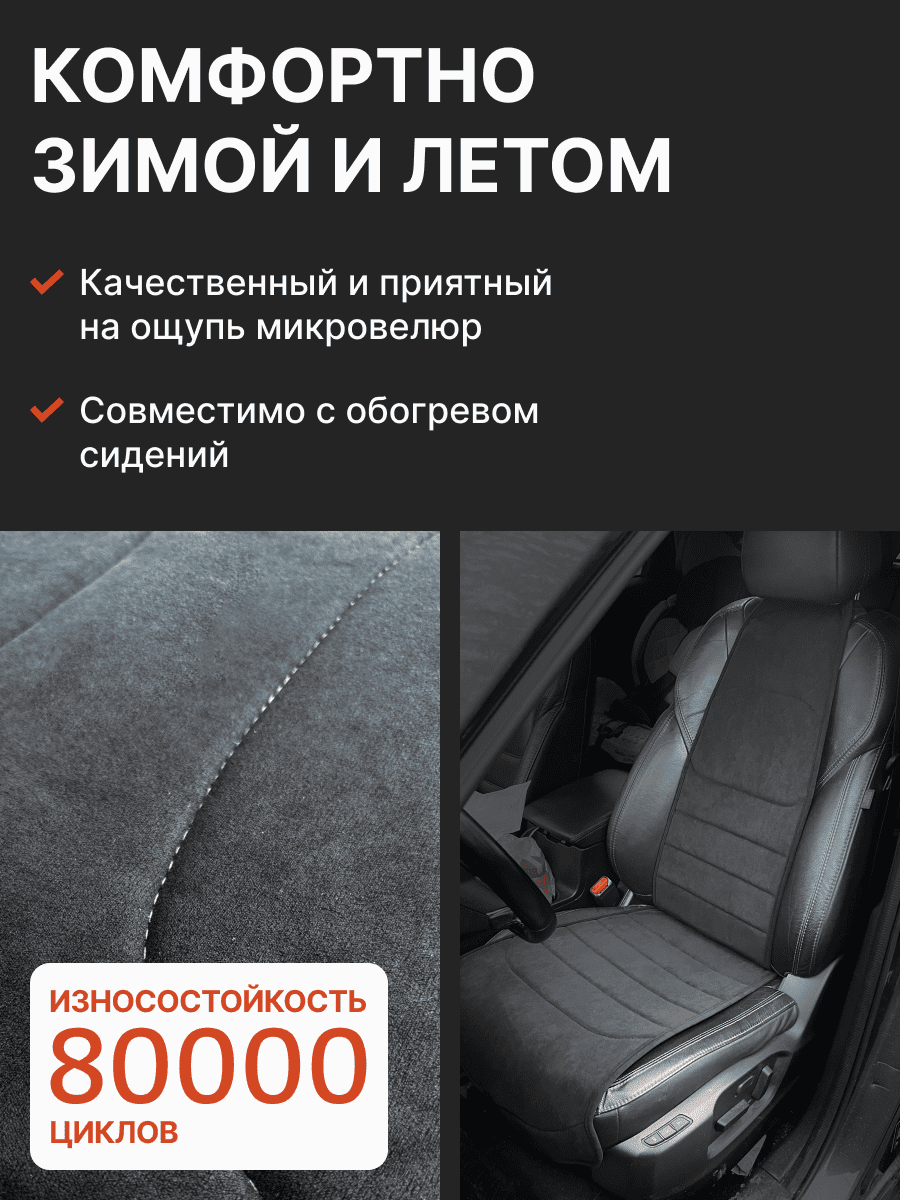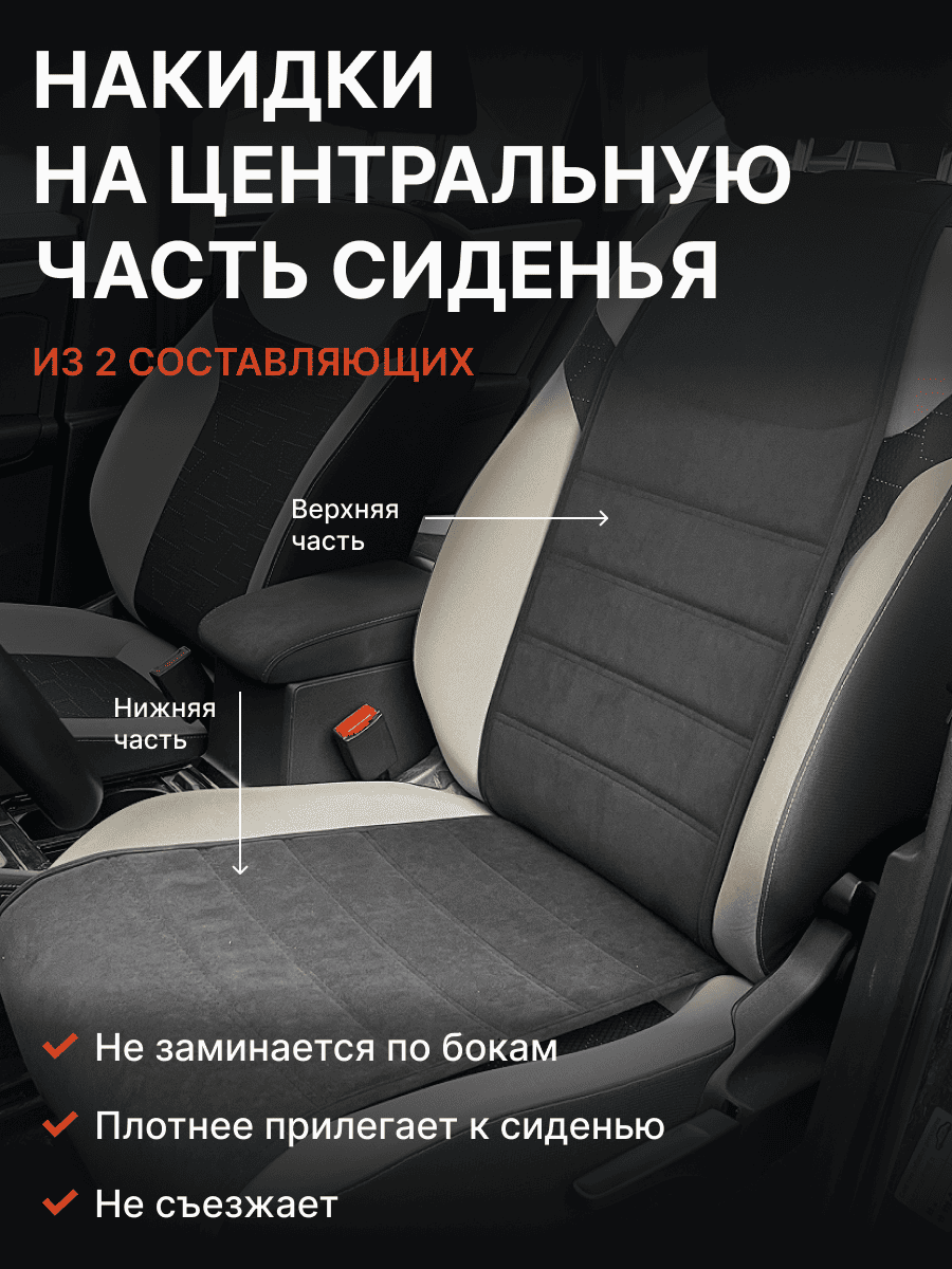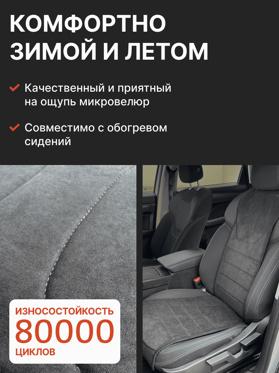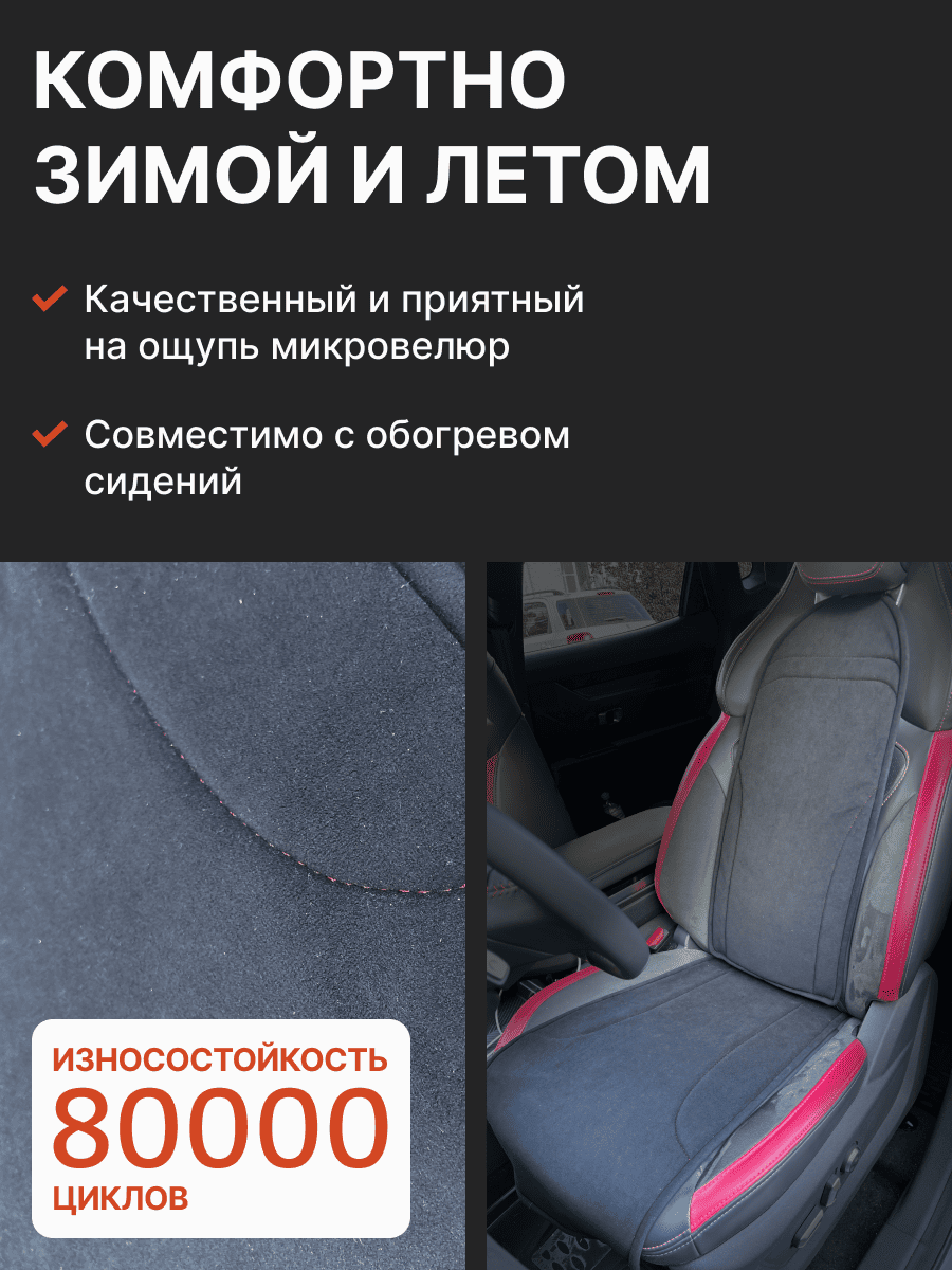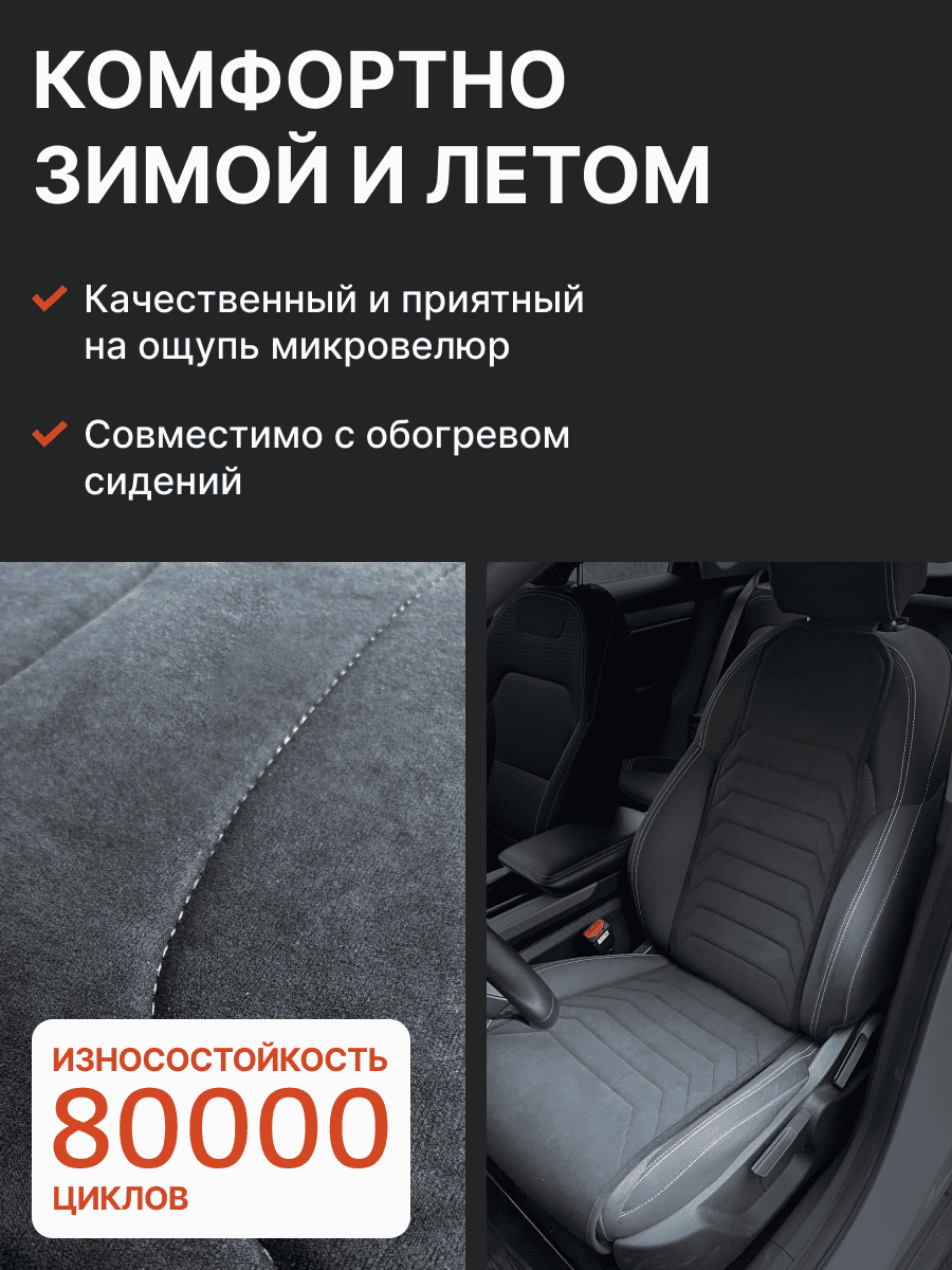 Совместимость: подходит для Haval F7/F7x (2 поколение) (2024, 2025). Материал: микровелюр — мягкий, приятный на ощупь, легко чистится, не выгорает. Назначение: защита оригинальной обивки от загрязнений, износа, повреждений. Комфорт зимой и летом. Крепление: надежная фиксация без смещений, простая установка без инструментов. Безопасность: не мешает срабатыванию боковых подушек безопасности (Airbag). Дизайн: современный внешний вид, улучшает интерьер салона. Уход: легко чистится влажной салфеткой или пылесосом.