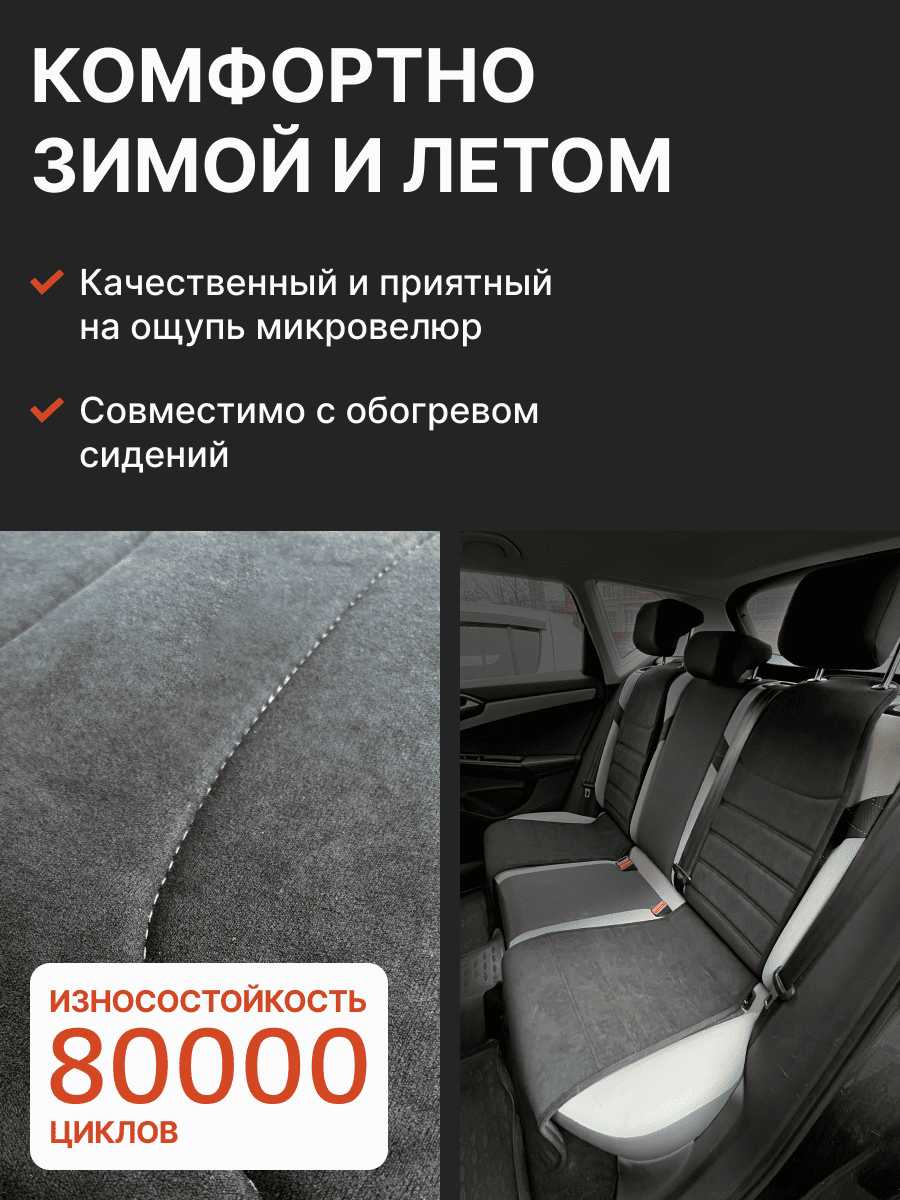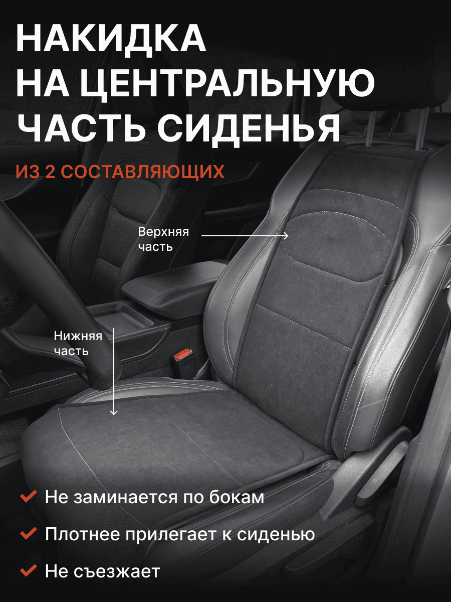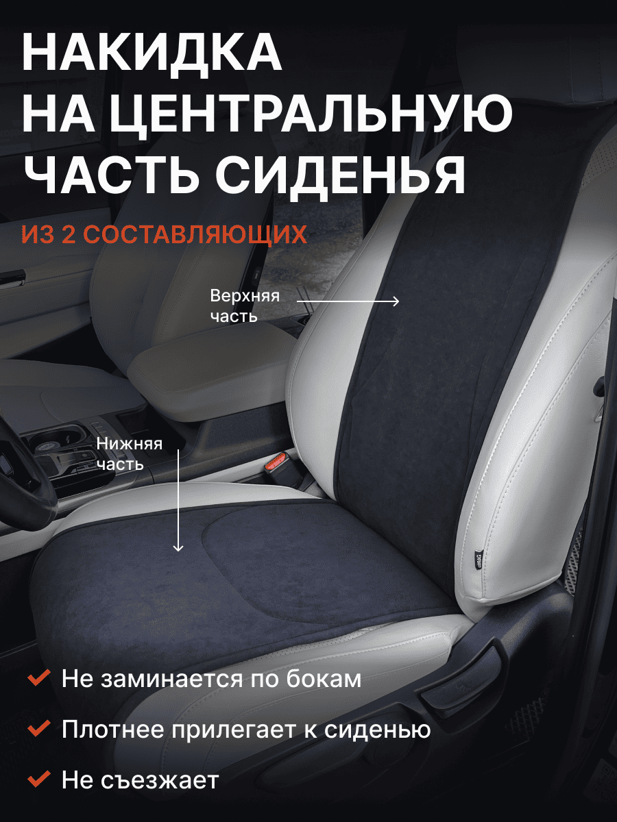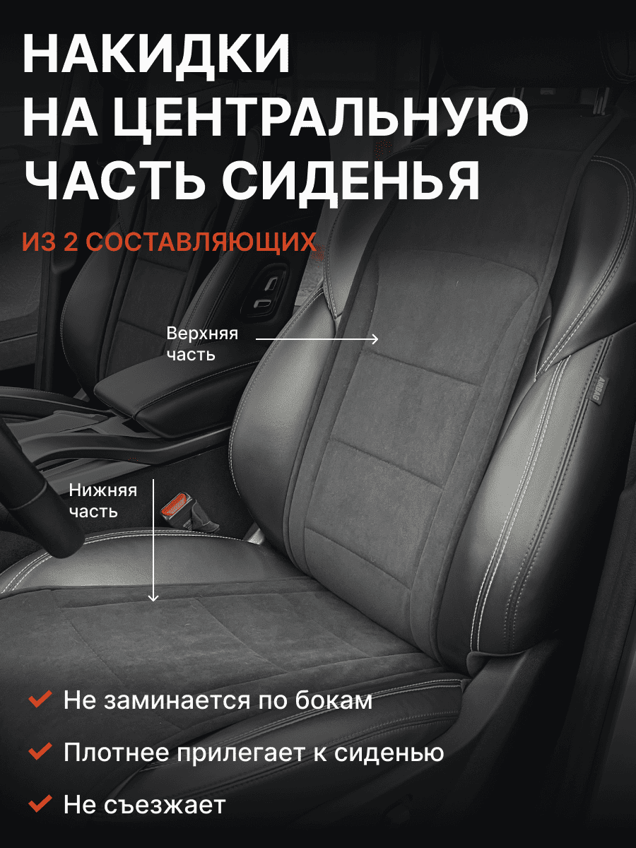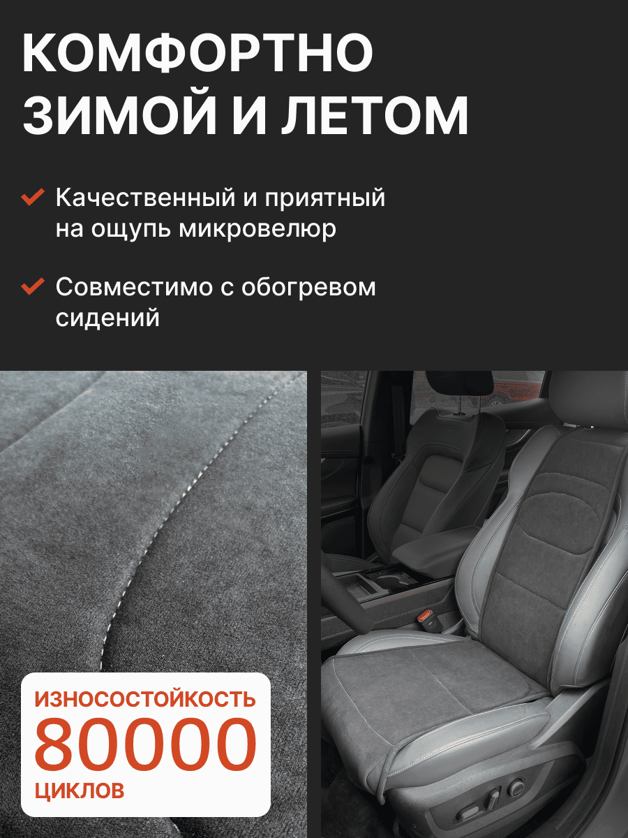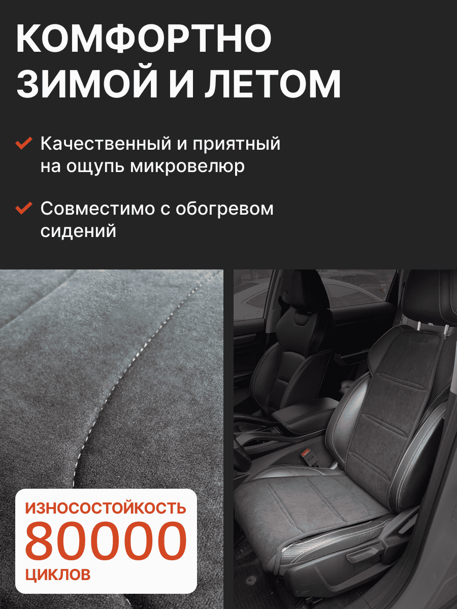 Совместимость: подходит для Haval F7/F7x (2 поколение) (2024, 2025). Материал: микровелюр — мягкий, приятный на ощупь, легко чистится, не выгорает. Назначение: защита оригинальной обивки от загрязнений, износа, повреждений. Комфорт зимой и летом. Крепление: надежная фиксация без смещений, простая установка без инструментов. Безопасность: не мешает срабатыванию боковых подушек безопасности (Airbag). Дизайн: современный внешний вид, улучшает интерьер салона. Уход: легко чистится влажной салфеткой или пылесосом.