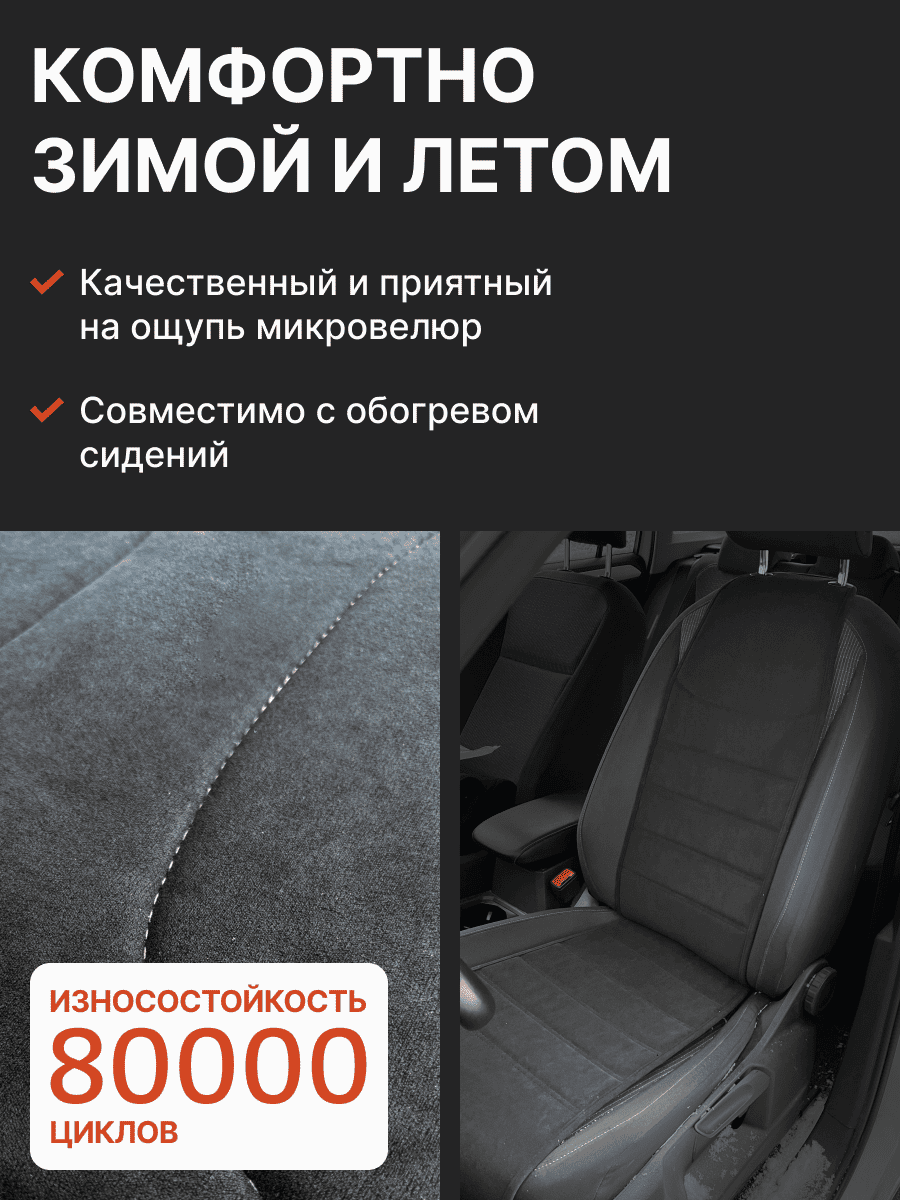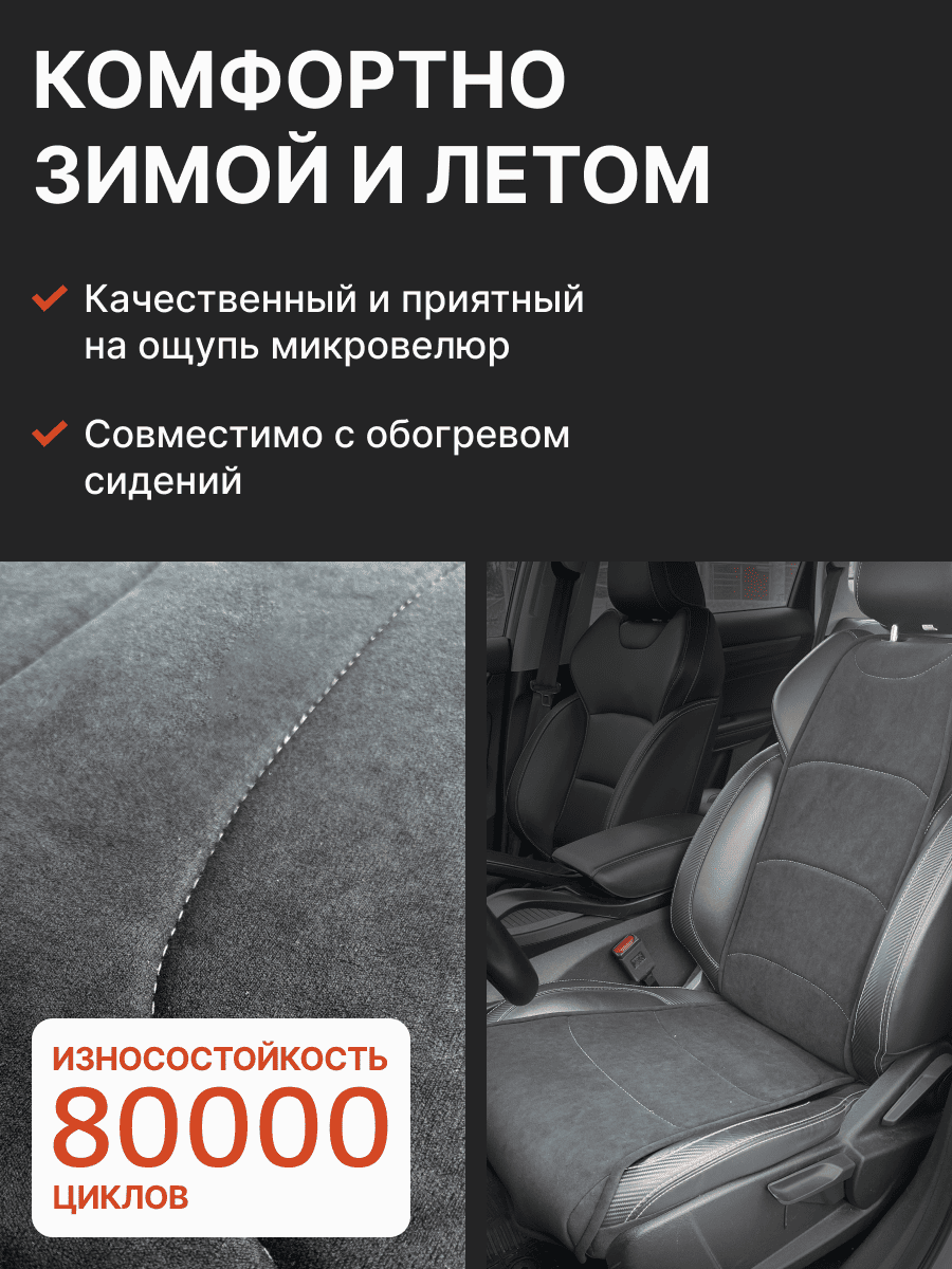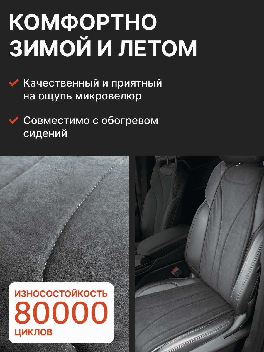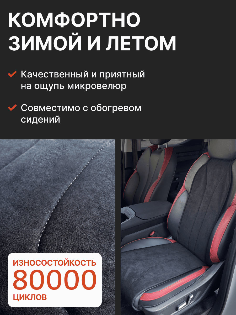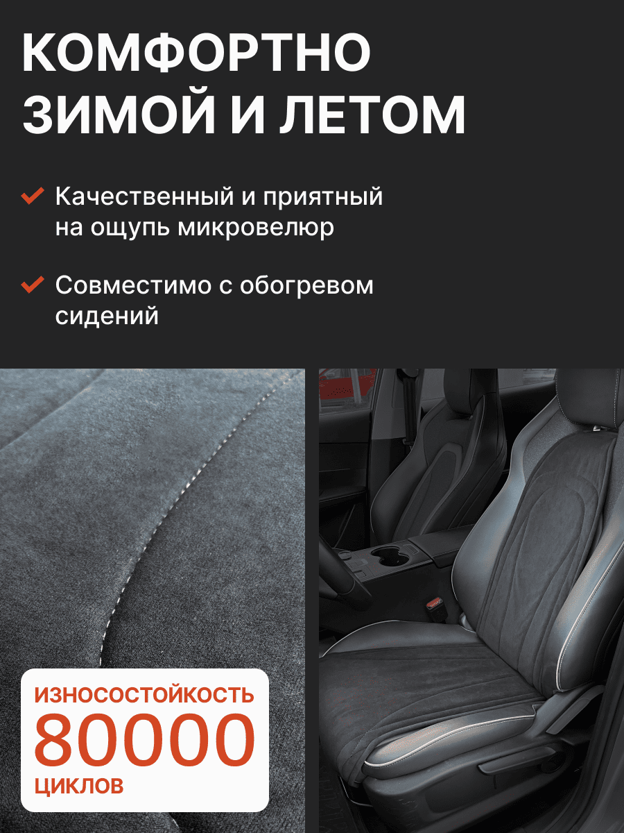 Совместимость: подходит для Haval F7/F7x (2 поколение) (2024, 2025). Материал: микровелюр — мягкий, приятный на ощупь, легко чистится, не выгорает. Назначение: защита оригинальной обивки от загрязнений, износа, повреждений. Комфорт зимой и летом. Крепление: надежная фиксация без смещений, простая установка без инструментов. Безопасность: не мешает срабатыванию боковых подушек безопасности (Airbag). Дизайн: современный внешний вид, улучшает интерьер салона. Уход: легко чистится влажной салфеткой или пылесосом.