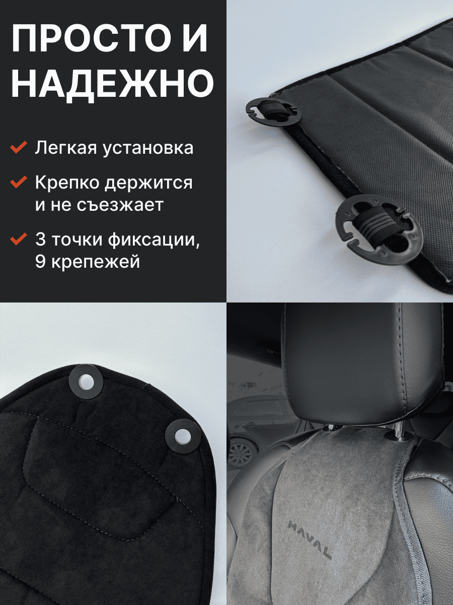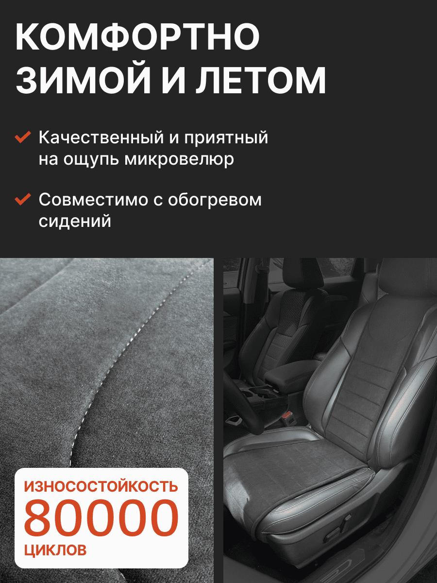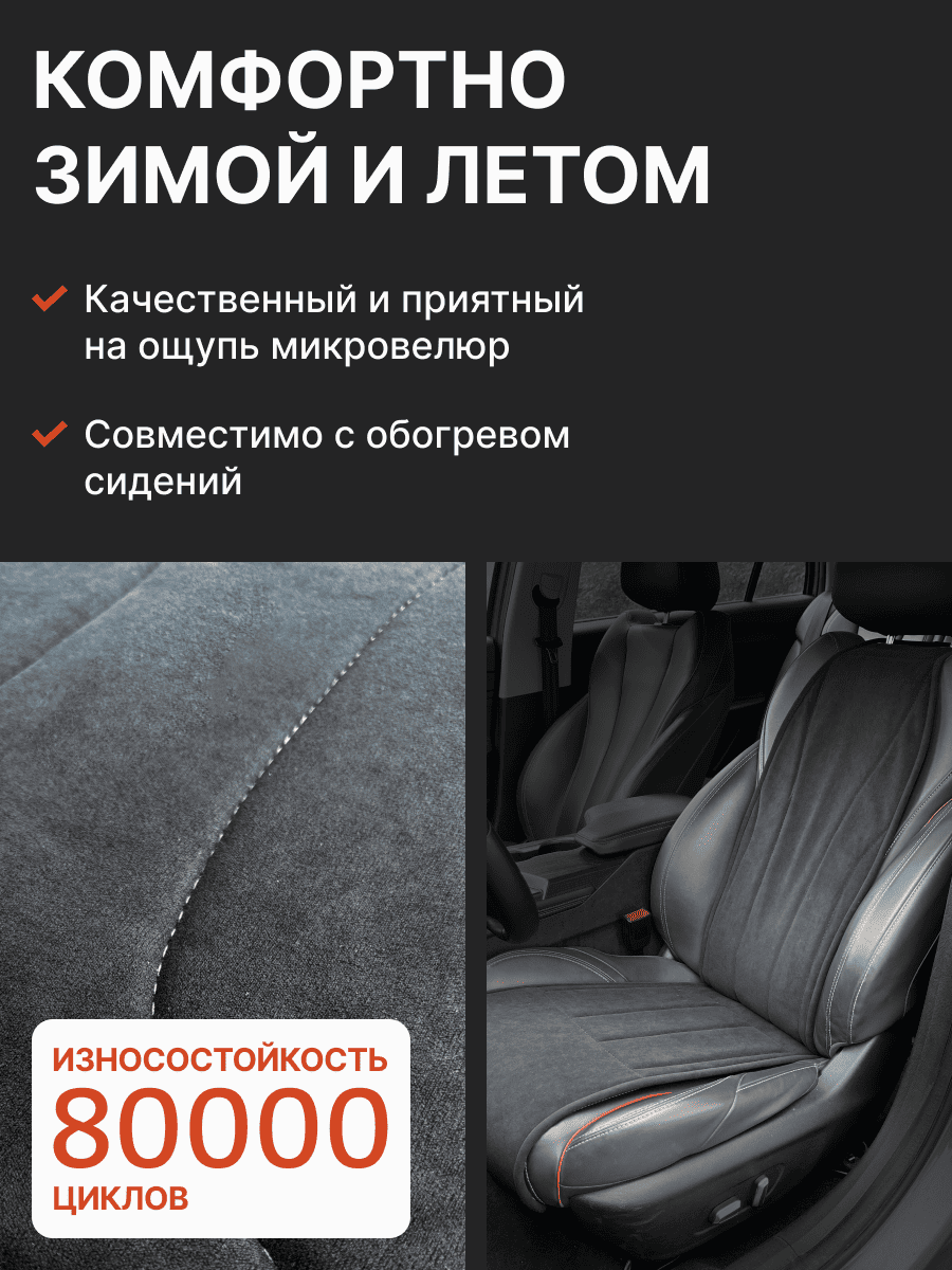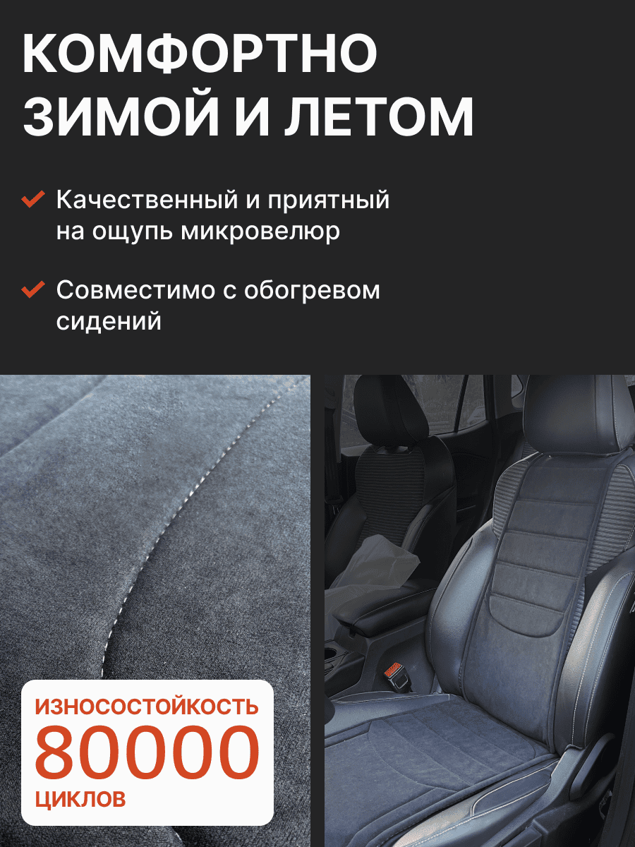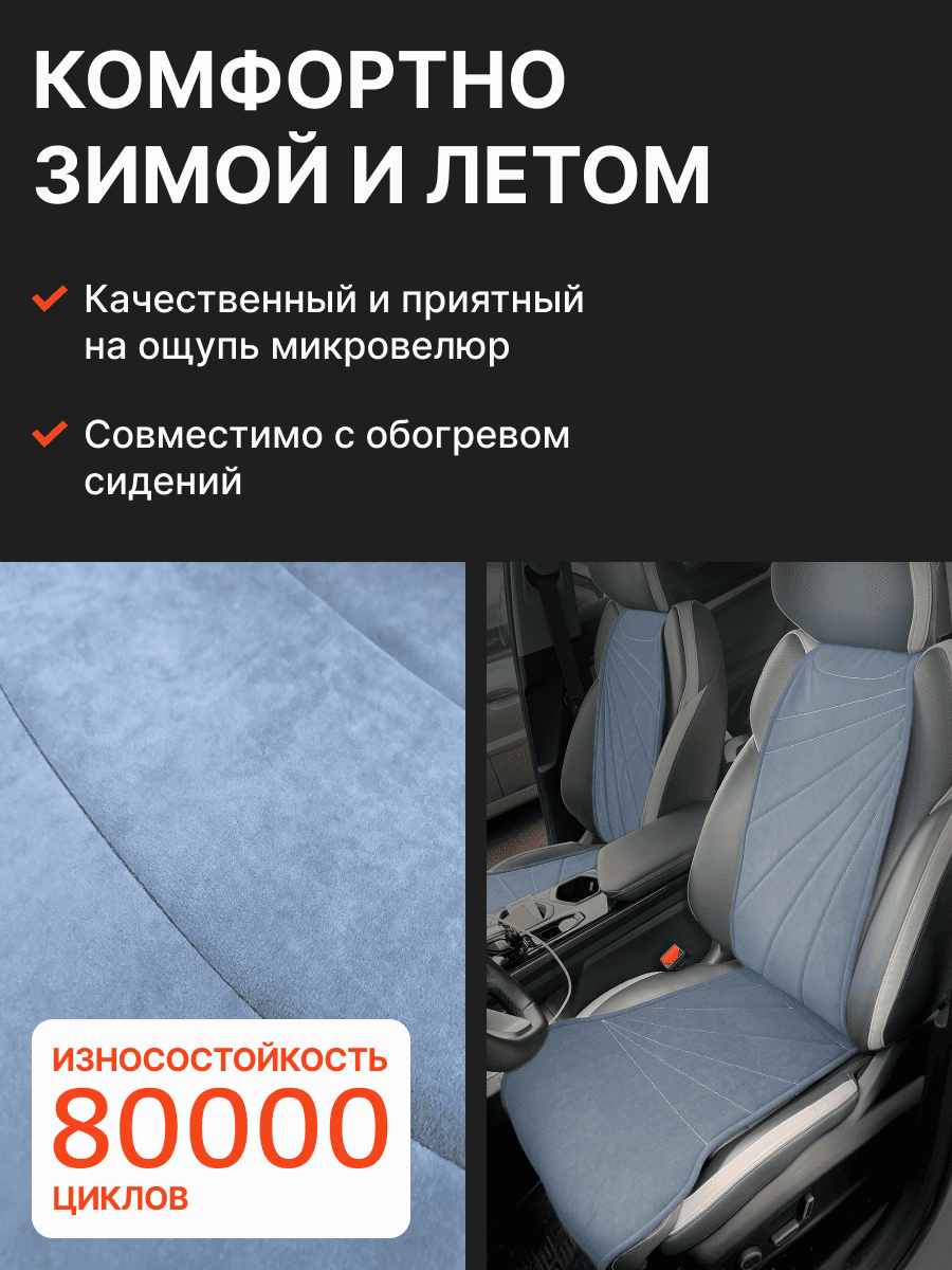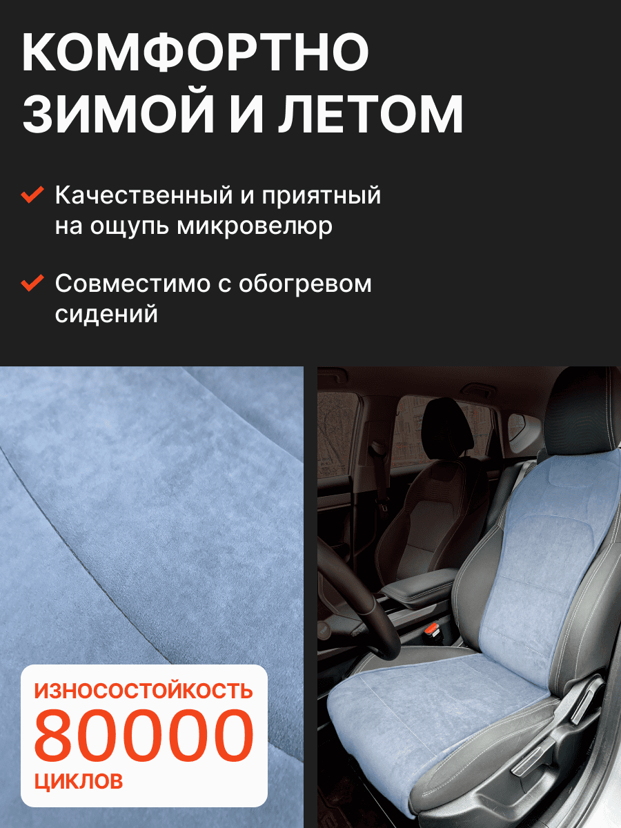 Совместимость: подходит для Haval F7/F7x (2 поколение) (2024, 2025). Материал: микровелюр — мягкий, приятный на ощупь, легко чистится, не выгорает. Назначение: защита оригинальной обивки от загрязнений, износа, повреждений. Комфорт зимой и летом. Крепление: надежная фиксация без смещений, простая установка без инструментов. Безопасность: не мешает срабатыванию боковых подушек безопасности (Airbag). Дизайн: современный внешний вид, улучшает интерьер салона. Уход: легко чистится влажной салфеткой или пылесосом.