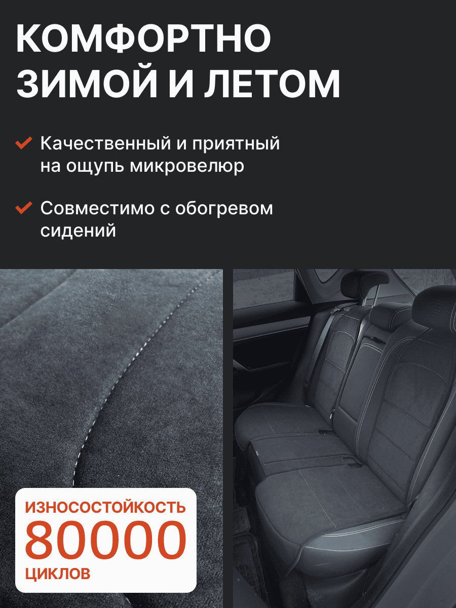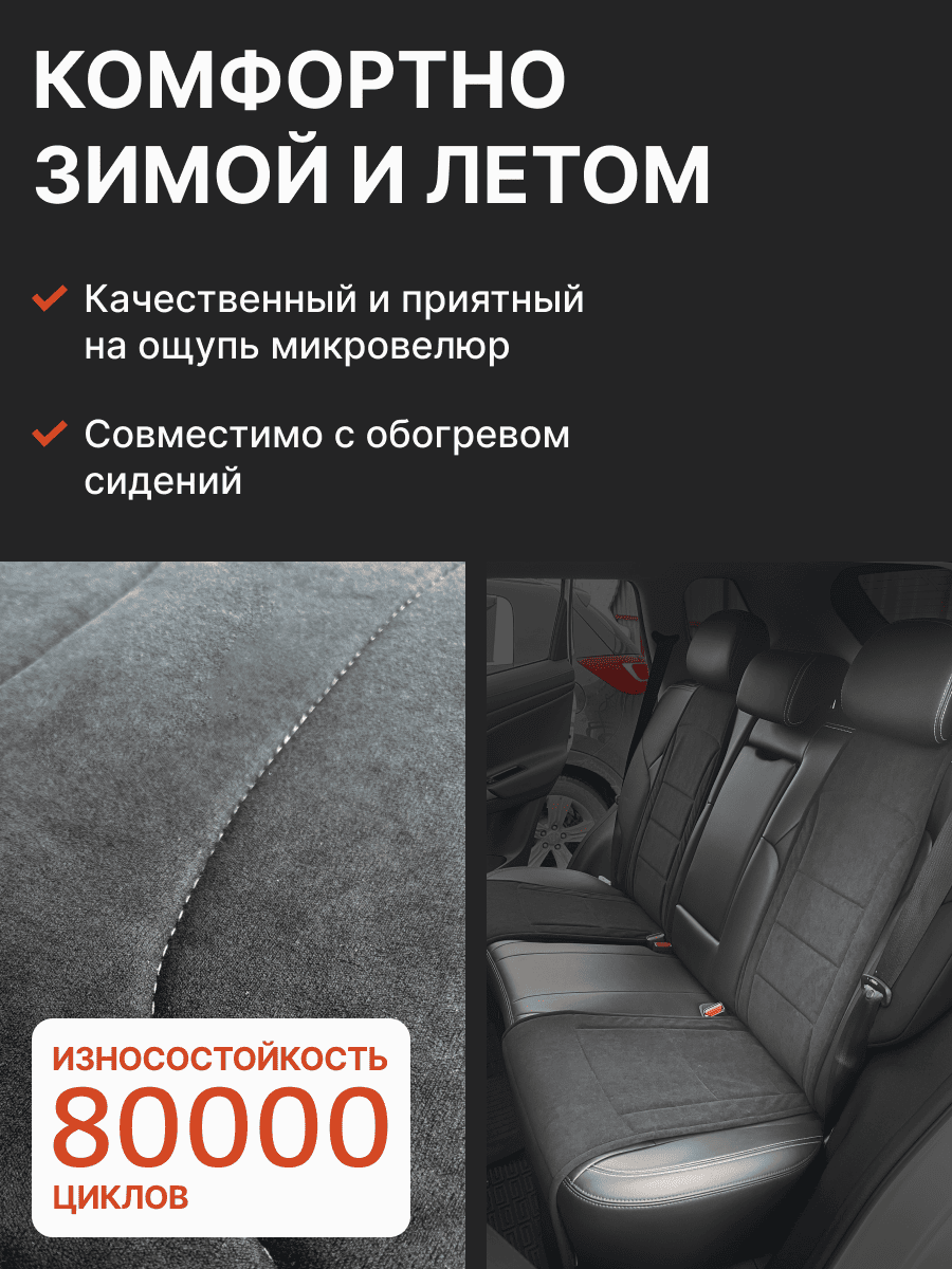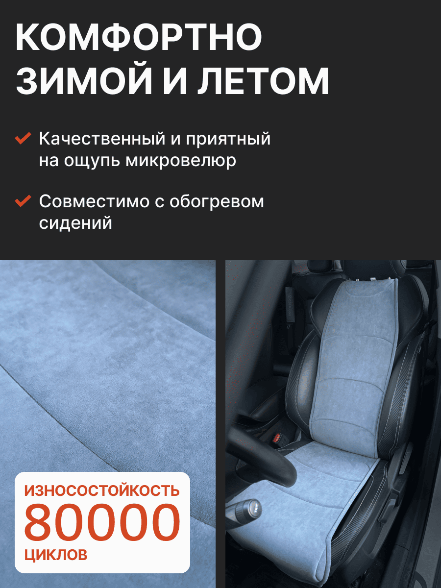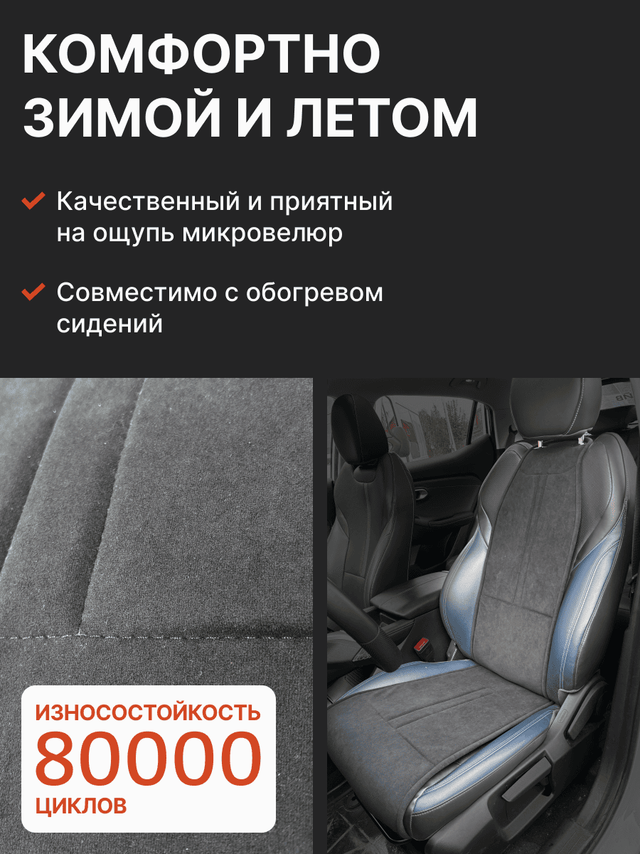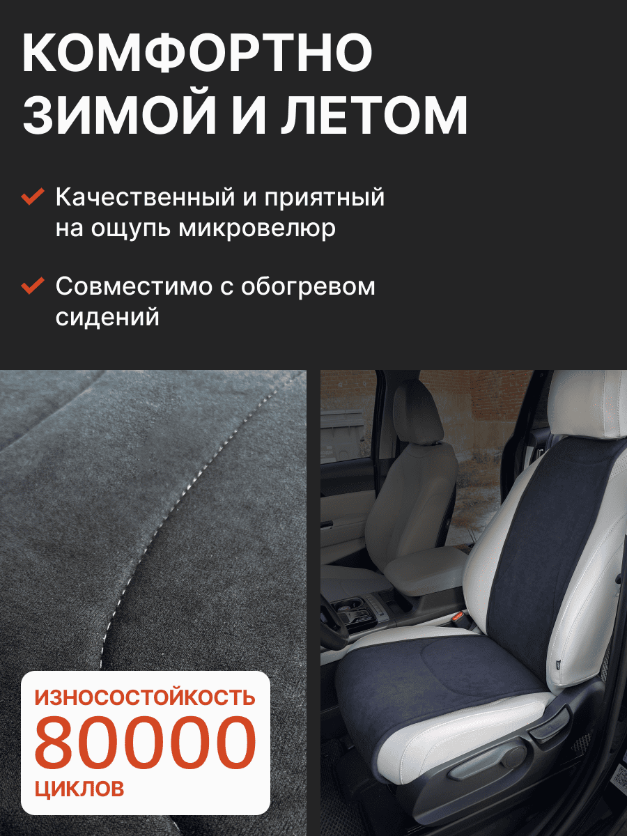 Совместимость: подходит для Haval F7/F7x (2 поколение) (2024, 2025). Материал: микровелюр — мягкий, приятный на ощупь, легко чистится, не выгорает. Назначение: защита оригинальной обивки от загрязнений, износа, повреждений. Комфорт зимой и летом. Крепление: надежная фиксация без смещений, простая установка без инструментов. Безопасность: не мешает срабатыванию боковых подушек безопасности (Airbag). Дизайн: современный внешний вид, улучшает интерьер салона. Уход: легко чистится влажной салфеткой или пылесосом.