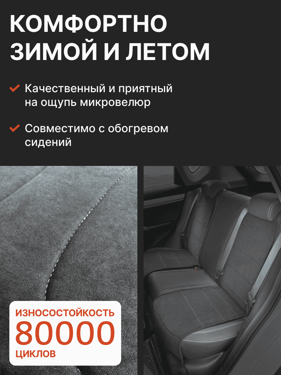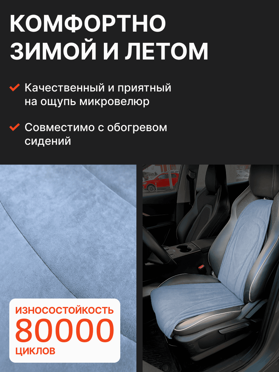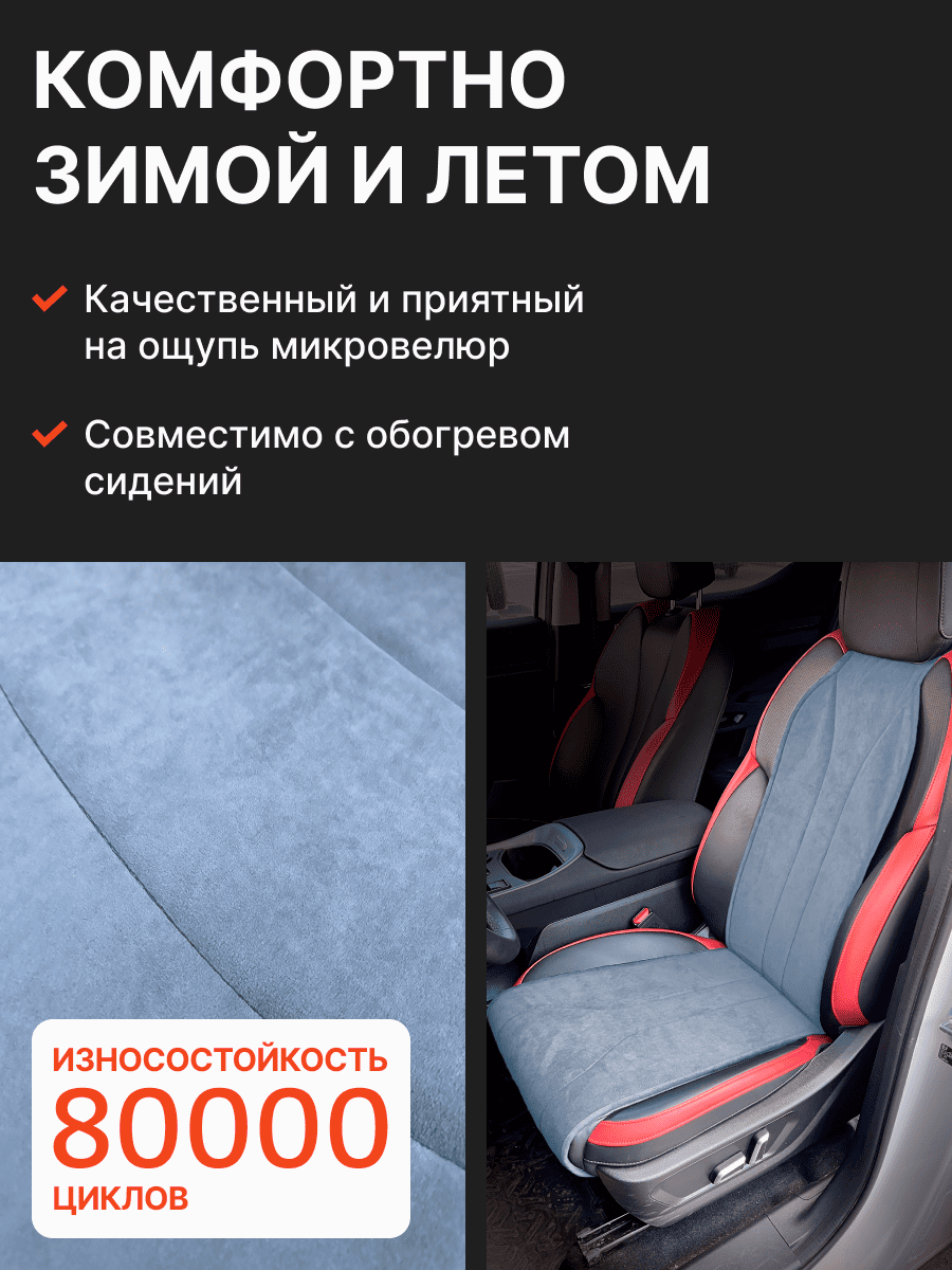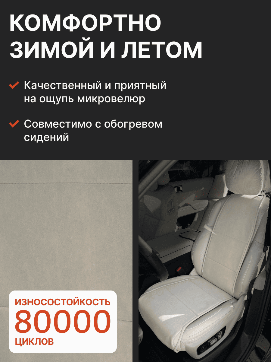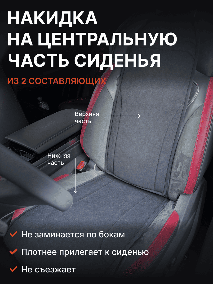 Совместимость: подходит для Haval F7/F7x (2 поколение) (2024, 2025). Материал: микровелюр — мягкий, приятный на ощупь, легко чистится, не выгорает. Назначение: защита оригинальной обивки от загрязнений, износа, повреждений. Комфорт зимой и летом. Крепление: надежная фиксация без смещений, простая установка без инструментов. Безопасность: не мешает срабатыванию боковых подушек безопасности (Airbag). Дизайн: современный внешний вид, улучшает интерьер салона. Уход: легко чистится влажной салфеткой или пылесосом.