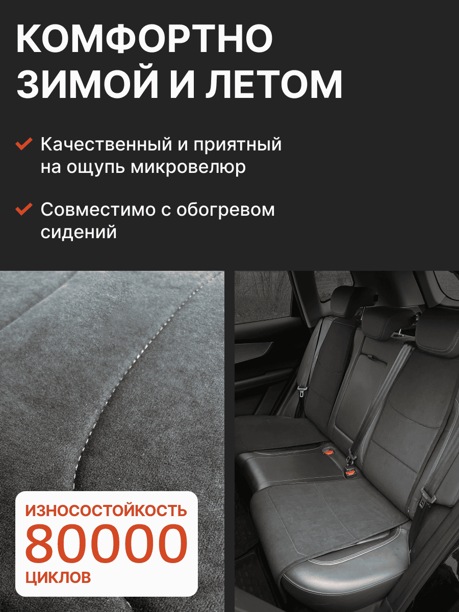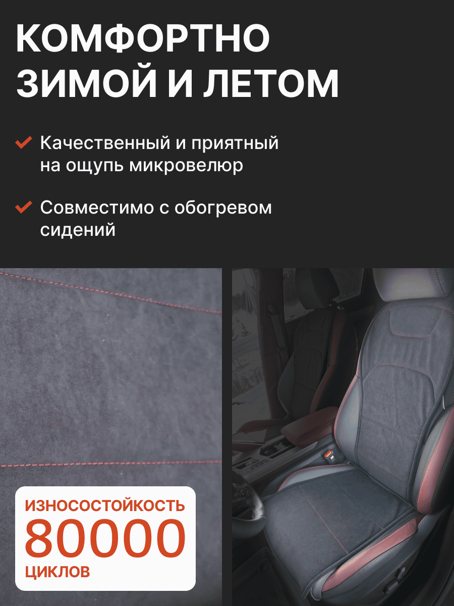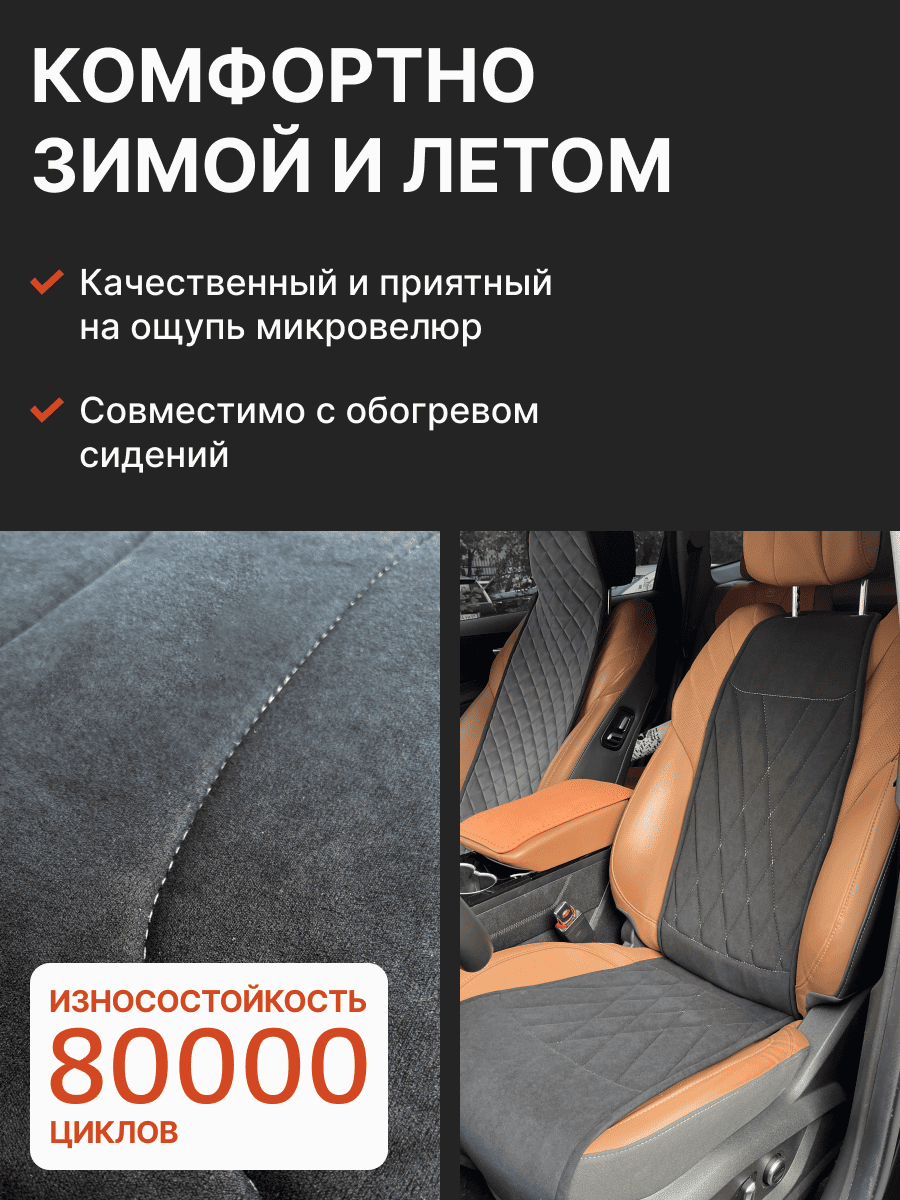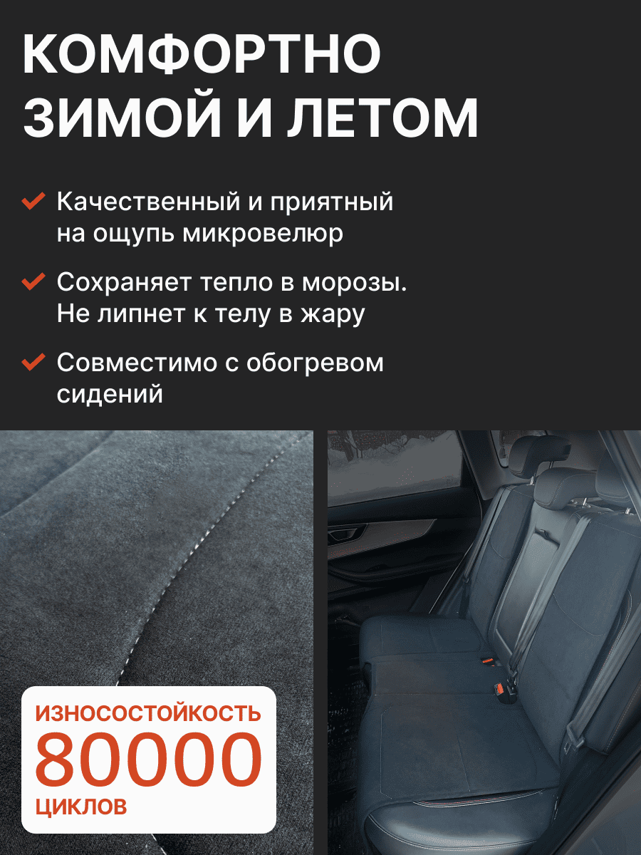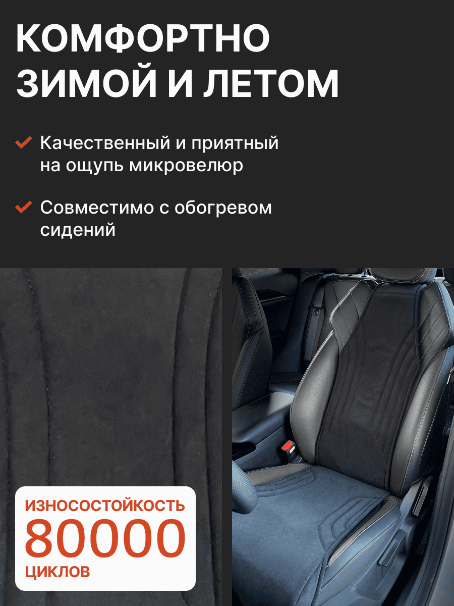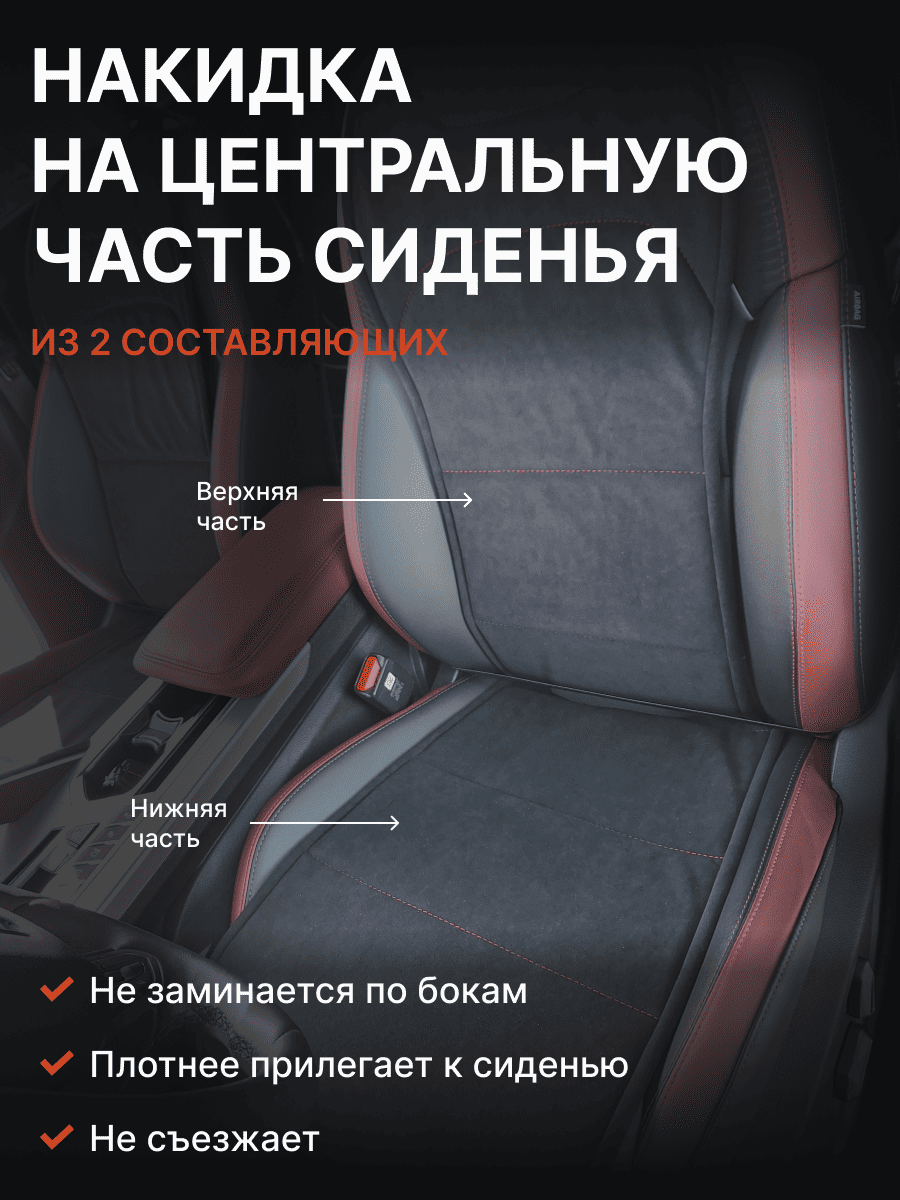 Совместимость: подходит для Haval F7/F7x (2 поколение) (2024, 2025). Материал: микровелюр — мягкий, приятный на ощупь, легко чистится, не выгорает. Назначение: защита оригинальной обивки от загрязнений, износа, повреждений. Комфорт зимой и летом. Крепление: надежная фиксация без смещений, простая установка без инструментов. Безопасность: не мешает срабатыванию боковых подушек безопасности (Airbag). Дизайн: современный внешний вид, улучшает интерьер салона. Уход: легко чистится влажной салфеткой или пылесосом.