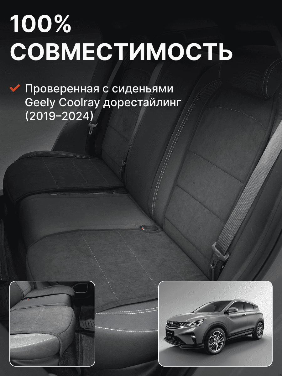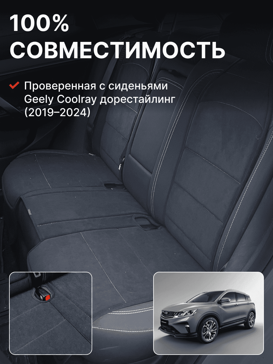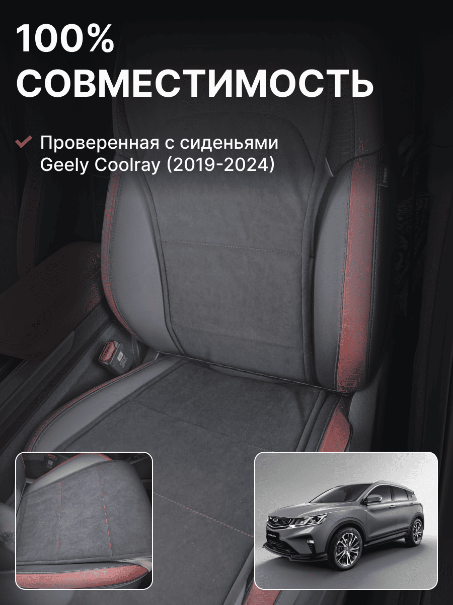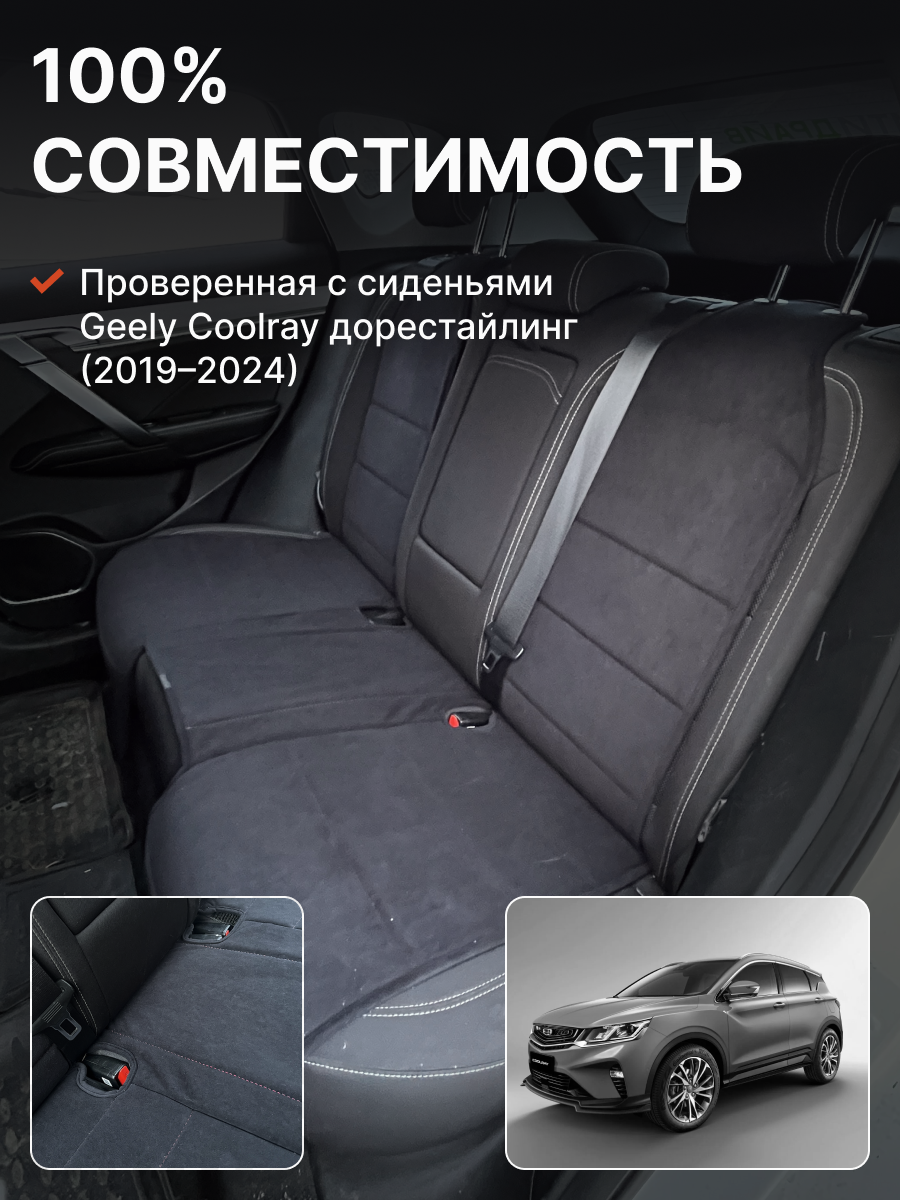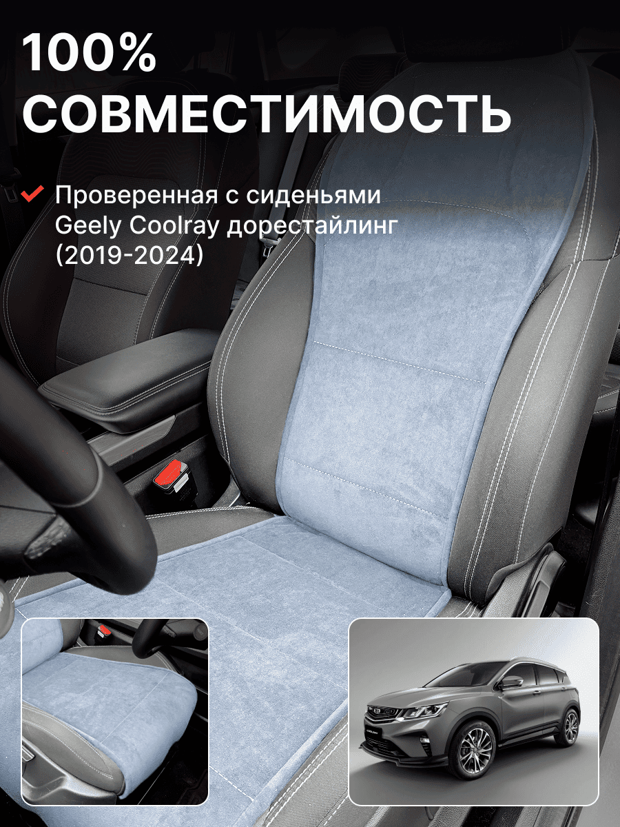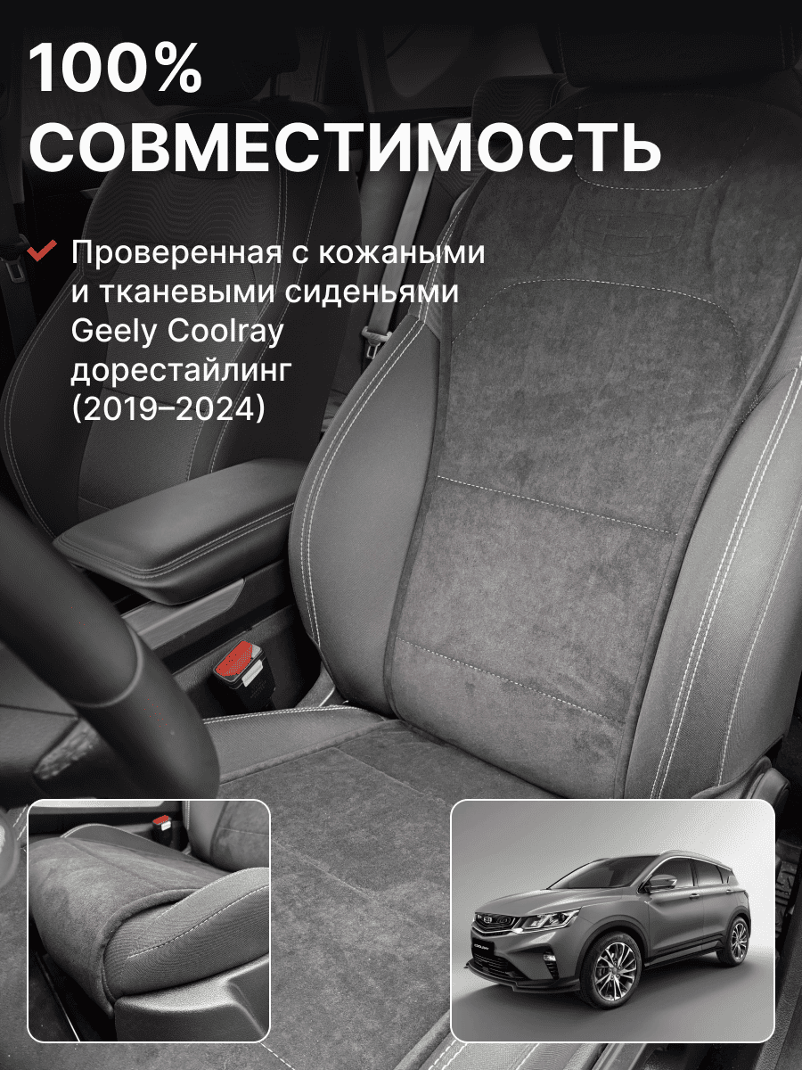 Совместимость: подходит для Geely Coolray (1 gen) рестайлинг (2024, 2025). Материал: микровелюр — мягкий, приятный на ощупь, легко чистится, не выгорает. Назначение: защита оригинальной обивки от загрязнений, износа, повреждений. Комфорт зимой и летом. Крепление: надежная фиксация без смещений, простая установка без инструментов. Безопасность: не мешает срабатыванию боковых подушек безопасности (Airbag). Дизайн: современный внешний вид, улучшает интерьер салона. Уход: легко чистится влажной салфеткой или пылесосом.
