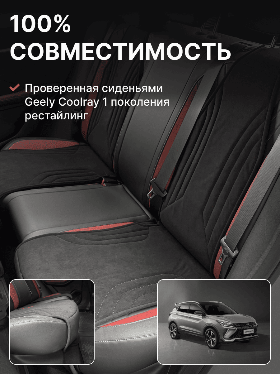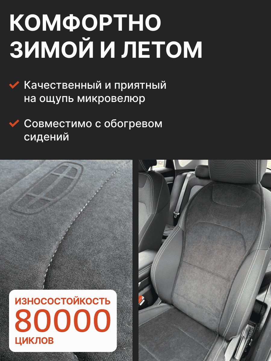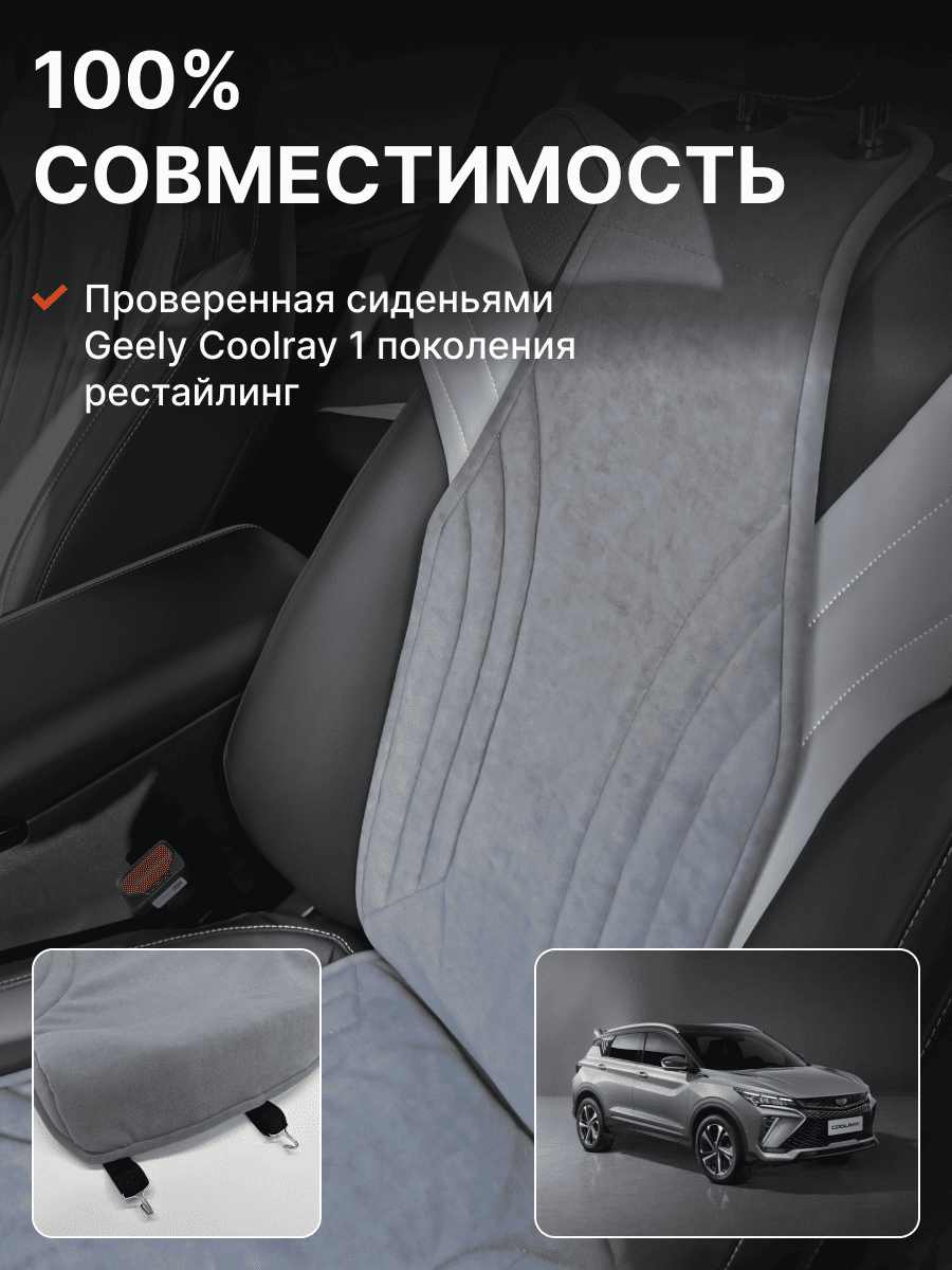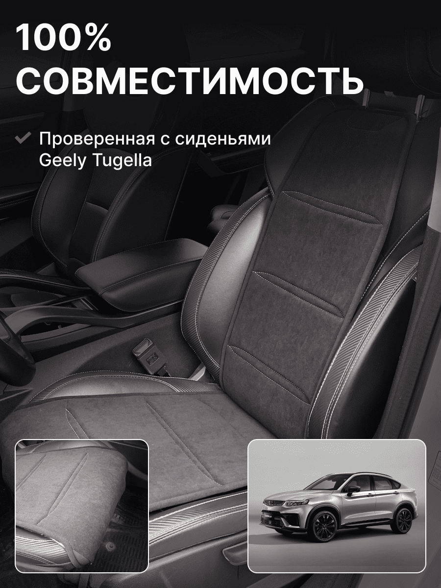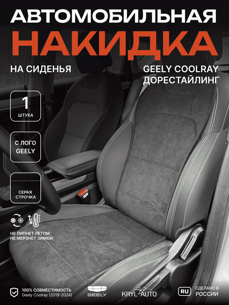 Совместимость: подходит для Geely Coolray (1 gen) рестайлинг (2024, 2025). Материал: микровелюр — мягкий, приятный на ощупь, легко чистится, не выгорает. Назначение: защита оригинальной обивки от загрязнений, износа, повреждений. Комфорт зимой и летом. Крепление: надежная фиксация без смещений, простая установка без инструментов. Безопасность: не мешает срабатыванию боковых подушек безопасности (Airbag). Дизайн: современный внешний вид, улучшает интерьер салона. Уход: легко чистится влажной салфеткой или пылесосом.