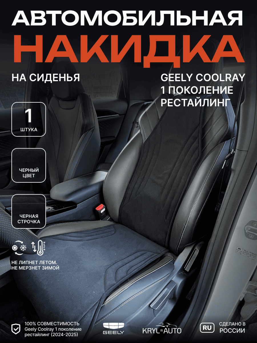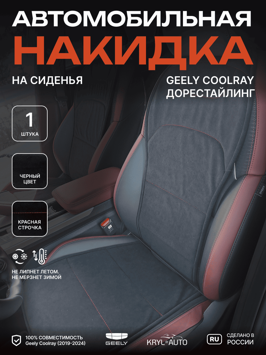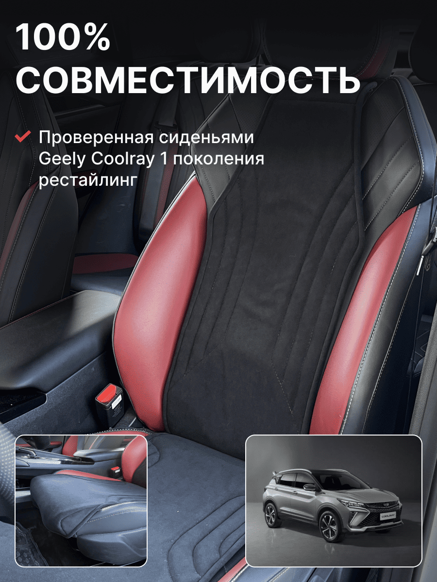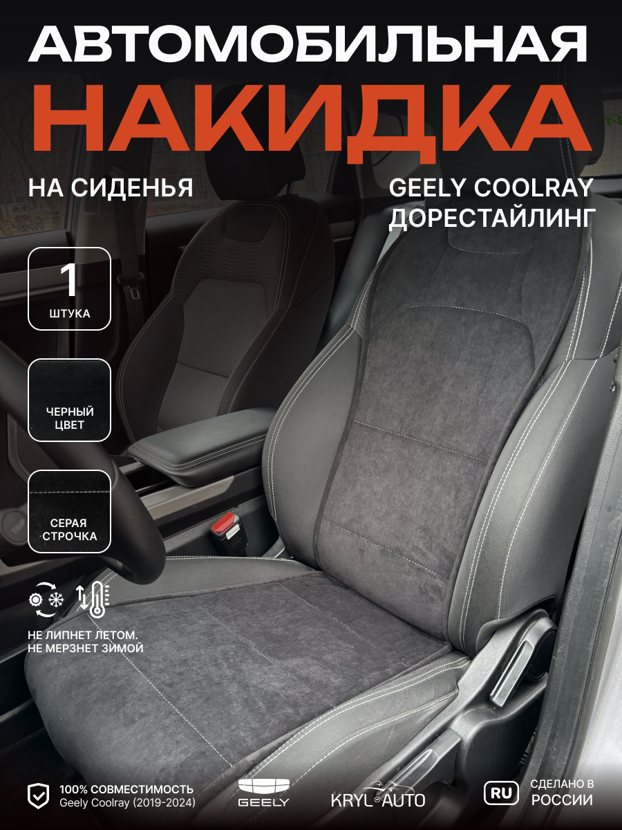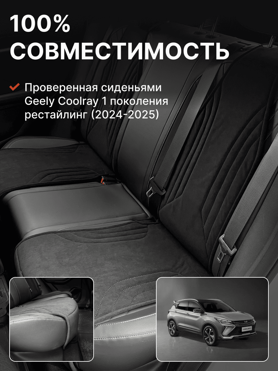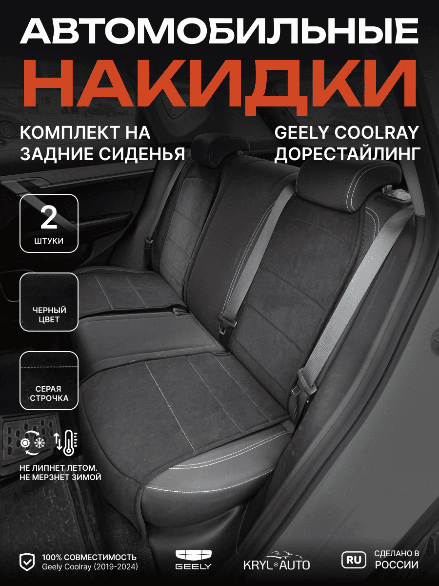 Совместимость: подходит для Geely Coolray (1 gen) рестайлинг (2024, 2025). Материал: микровелюр — мягкий, приятный на ощупь, легко чистится, не выгорает. Назначение: защита оригинальной обивки от загрязнений, износа, повреждений. Комфорт зимой и летом. Крепление: надежная фиксация без смещений, простая установка без инструментов. Безопасность: не мешает срабатыванию боковых подушек безопасности (Airbag). Дизайн: современный внешний вид, улучшает интерьер салона. Уход: легко чистится влажной салфеткой или пылесосом.
