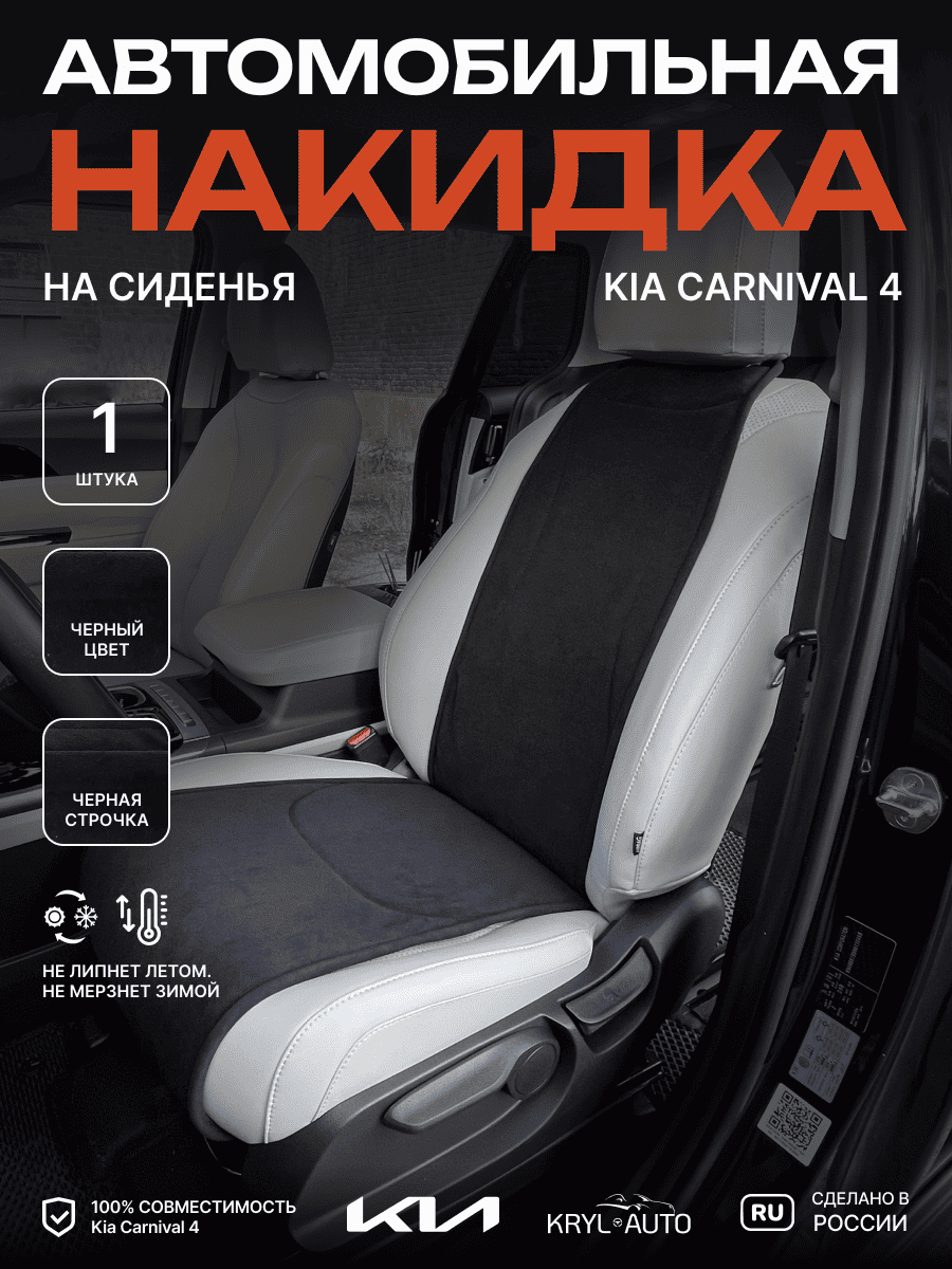 Совместимость: подходит для Kia Carnival 4. Материал: микровелюр — мягкий, приятный на ощупь, легко чистится, не выгорает. Назначение: защита оригинальной обивки от загрязнений, износа, повреждений. Комфорт зимой и летом. Крепление: надежная фиксация без смещений, простая установка без инструментов. Безопасность: не мешает срабатыванию боковых подушек безопасности (Airbag). Дизайн: современный внешний вид, улучшает интерьер салона. Уход: легко чистится влажной салфеткой или пылесосом.