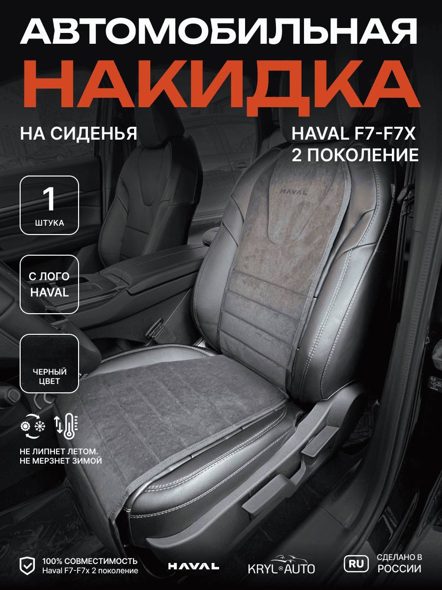 Совместимость: подходит для Haval F7/F7x (2 поколение) (2024, 2025). Материал: микровелюр — мягкий, приятный на ощупь, легко чистится, не выгорает. Назначение: защита оригинальной обивки от загрязнений, износа, повреждений. Комфорт зимой и летом. Крепление: надежная фиксация без смещений, простая установка без инструментов. Безопасность: не мешает срабатыванию боковых подушек безопасности (Airbag). Дизайн: современный внешний вид, с логотипом бренда Haval, улучшает интерьер салона. Уход: легко чистится влажной салфеткой или пылесосом.