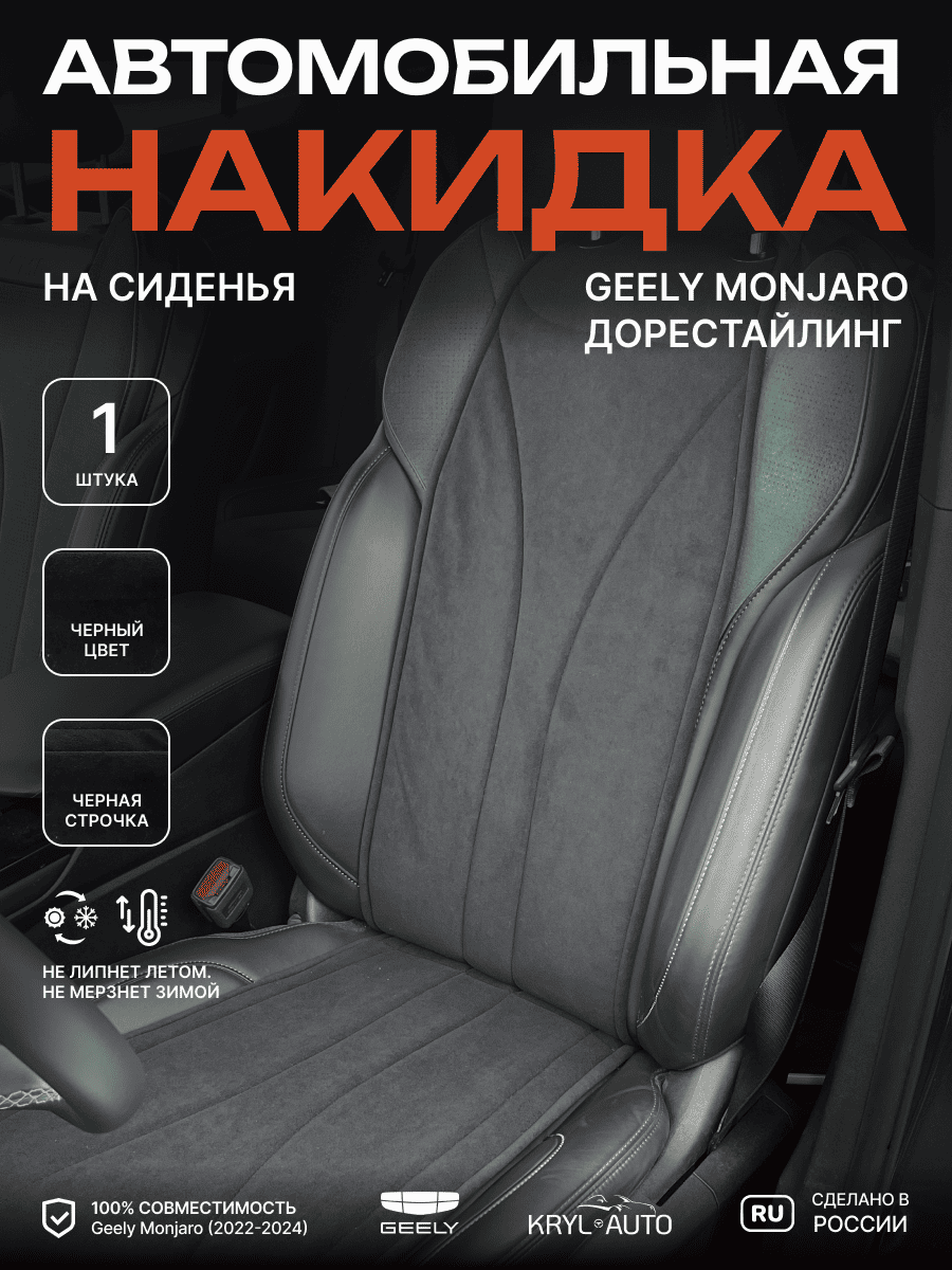 Совместимость: подходит для Geely Monjaro. Материал: микровелюр — мягкий, приятный на ощупь, легко чистится, не выгорает. Назначение: защита оригинальной обивки от загрязнений, износа, повреждений. Комфорт зимой и летом. Крепление: надежная фиксация без смещений, простая установка без инструментов. Безопасность: не мешает срабатыванию боковых подушек безопасности (Airbag). Дизайн: современный внешний вид, улучшает интерьер салона. Уход: легко чистится влажной салфеткой или пылесосом.