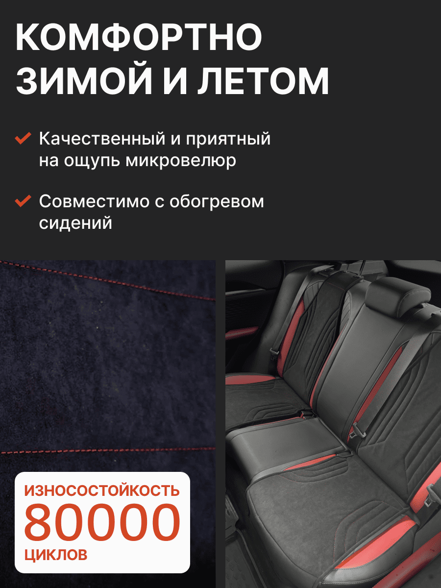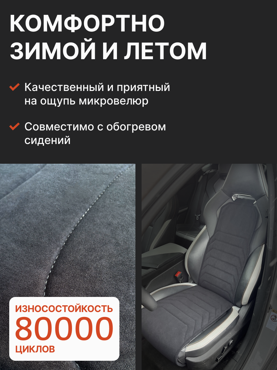 Совместимость: подходит для Omoda C5. Материал: микровелюр — мягкий, приятный на ощупь, легко чистится, не выгорает. Назначение: защита оригинальной обивки от загрязнений, износа, повреждений. Комфорт зимой и летом. Крепление: надежная фиксация без смещений, простая установка без инструментов. Безопасность: не мешает срабатыванию боковых подушек безопасности (Airbag). Дизайн: современный внешний вид, улучшает интерьер салона. Уход: легко чистится влажной салфеткой или пылесосом.