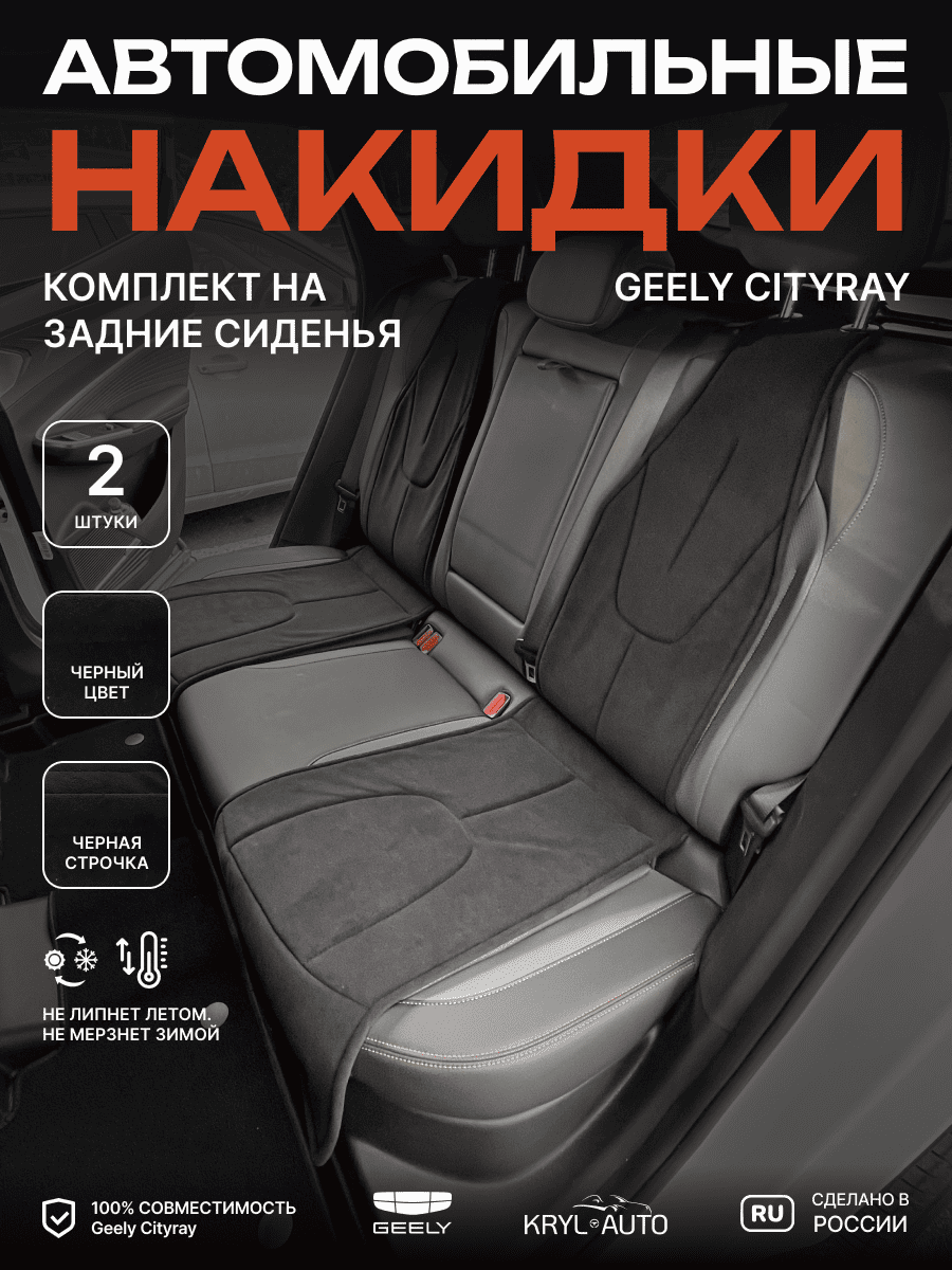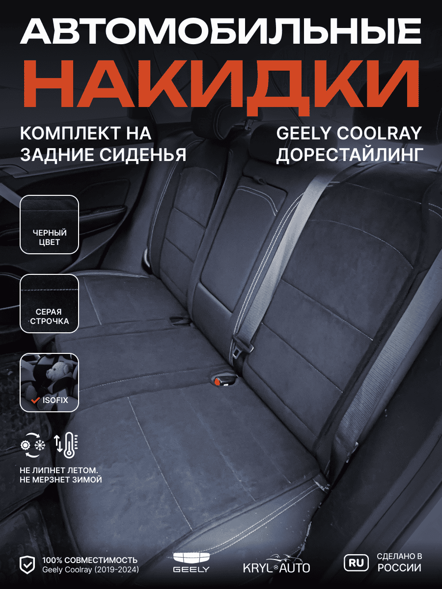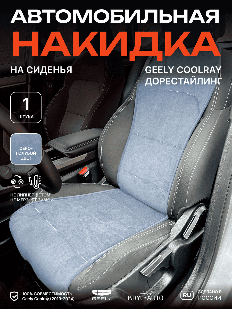Совместимость: подходит для Geely Coolray дорестайлинг (2019-2024). Материал: микровелюр — мягкий, приятный на ощупь, легко чистится, не выгорает. Назначение: защита оригинальной обивки от загрязнений, износа, повреждений. Комфорт зимой и летом. Крепление: надежная фиксация без смещений, простая установка без инструментов. Безопасность: не мешает срабатыванию боковых подушек безопасности (Airbag). Дизайн: современный внешний вид, улучшает интерьер салона. Уход: легко чистится влажной салфеткой или пылесосом.