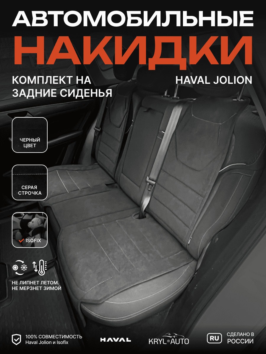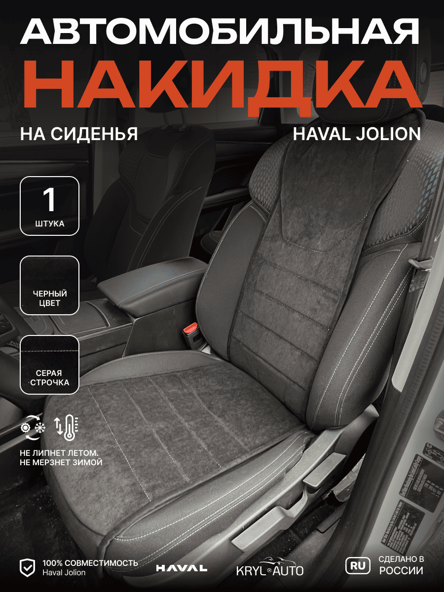 Совместимость: подходит для Haval Jolion (2021,2022,2023,2024,2025). Материал: микровелюр — мягкий, приятный на ощупь, легко чистится, не выгорает. Назначение: защита оригинальной обивки от загрязнений, износа, повреждений. Комфорт зимой и летом. Крепление: надежная фиксация без смещений, простая установка без инструментов. Безопасность: не мешает срабатыванию боковых подушек безопасности (Airbag). Дизайн: современный внешний вид, с логотипом бренда Haval, улучшает интерьер салона. Уход: легко чистится влажной салфеткой или пылесосом.