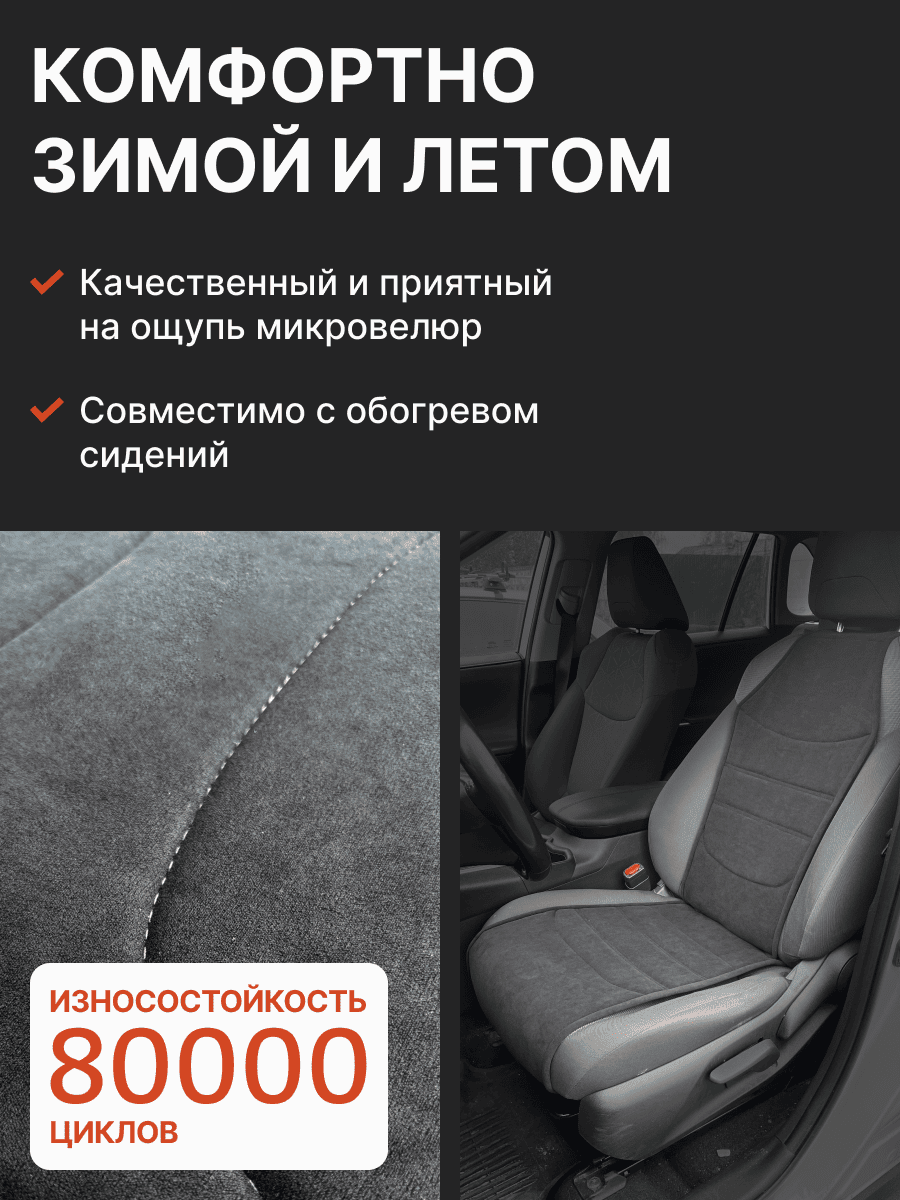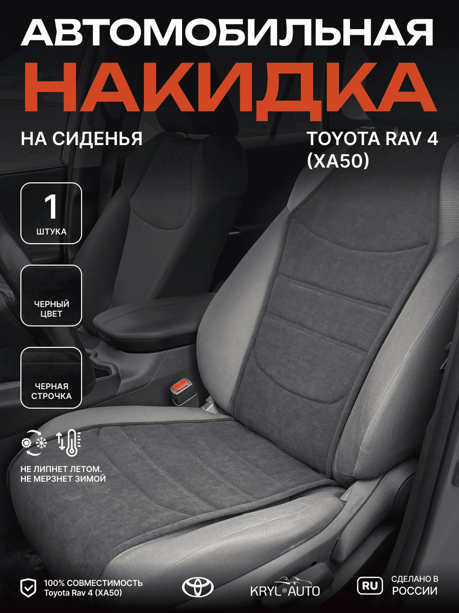 Совместимость: подходит для Toyota Rav 4 (XA50). Материал: микровелюр — мягкий, приятный на ощупь, легко чистится, не выгорает. Назначение: защита оригинальной обивки от загрязнений, износа, повреждений. Комфорт зимой и летом. Крепление: надежная фиксация без смещений, простая установка без инструментов. Безопасность: не мешает срабатыванию боковых подушек безопасности (Airbag). Дизайн: современный внешний вид, улучшает интерьер салона. Уход: легко чистится влажной салфеткой или пылесосом.