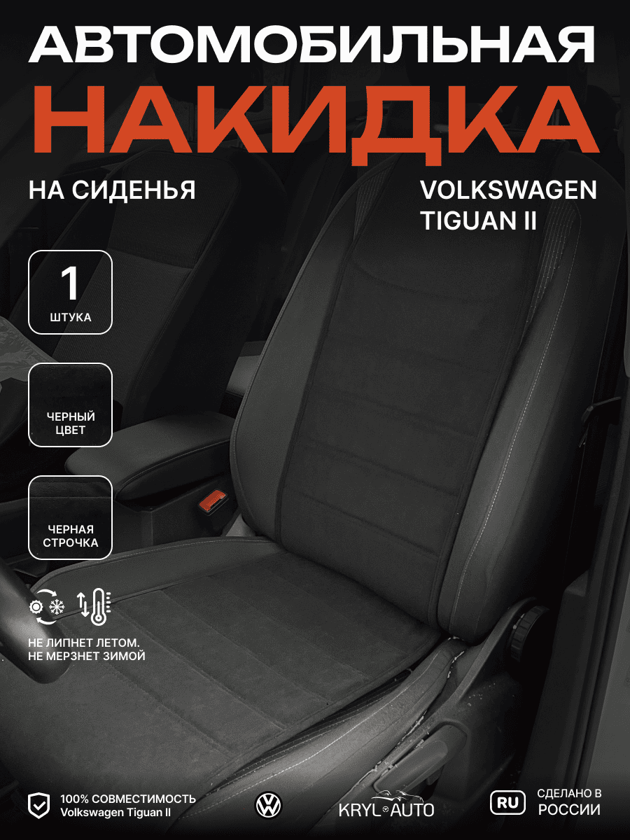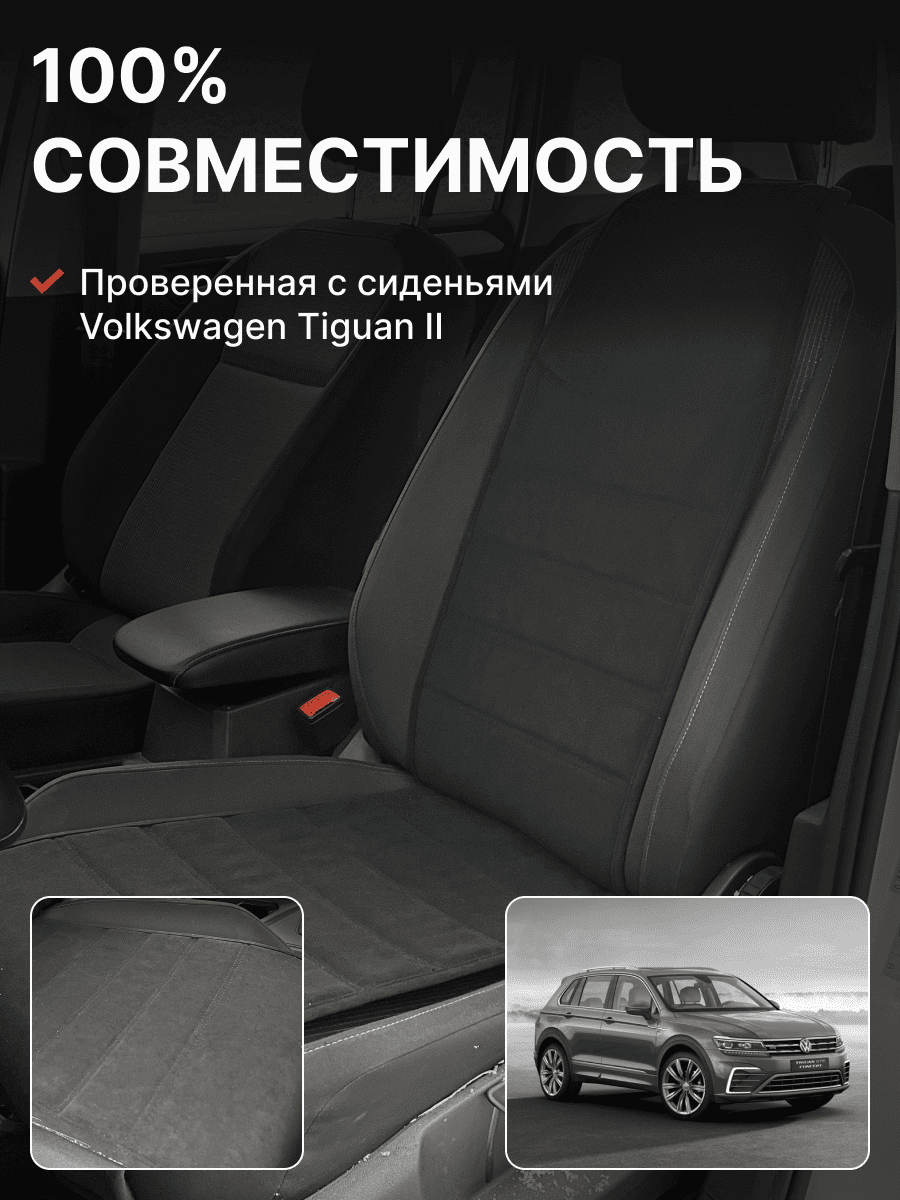 Совместимость: подходит для Volkswagen Tiguan II. Материал: микровелюр — мягкий, приятный на ощупь, легко чистится, не выгорает. Назначение: защита оригинальной обивки от загрязнений, износа, повреждений. Комфорт зимой и летом. Крепление: надежная фиксация без смещений, простая установка без инструментов. Безопасность: не мешает срабатыванию боковых подушек безопасности (Airbag). Дизайн: современный внешний вид, улучшает интерьер салона. Уход: легко чистится влажной салфеткой или пылесосом.