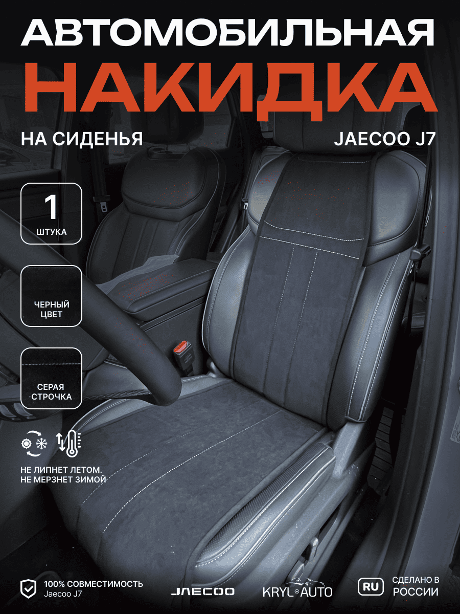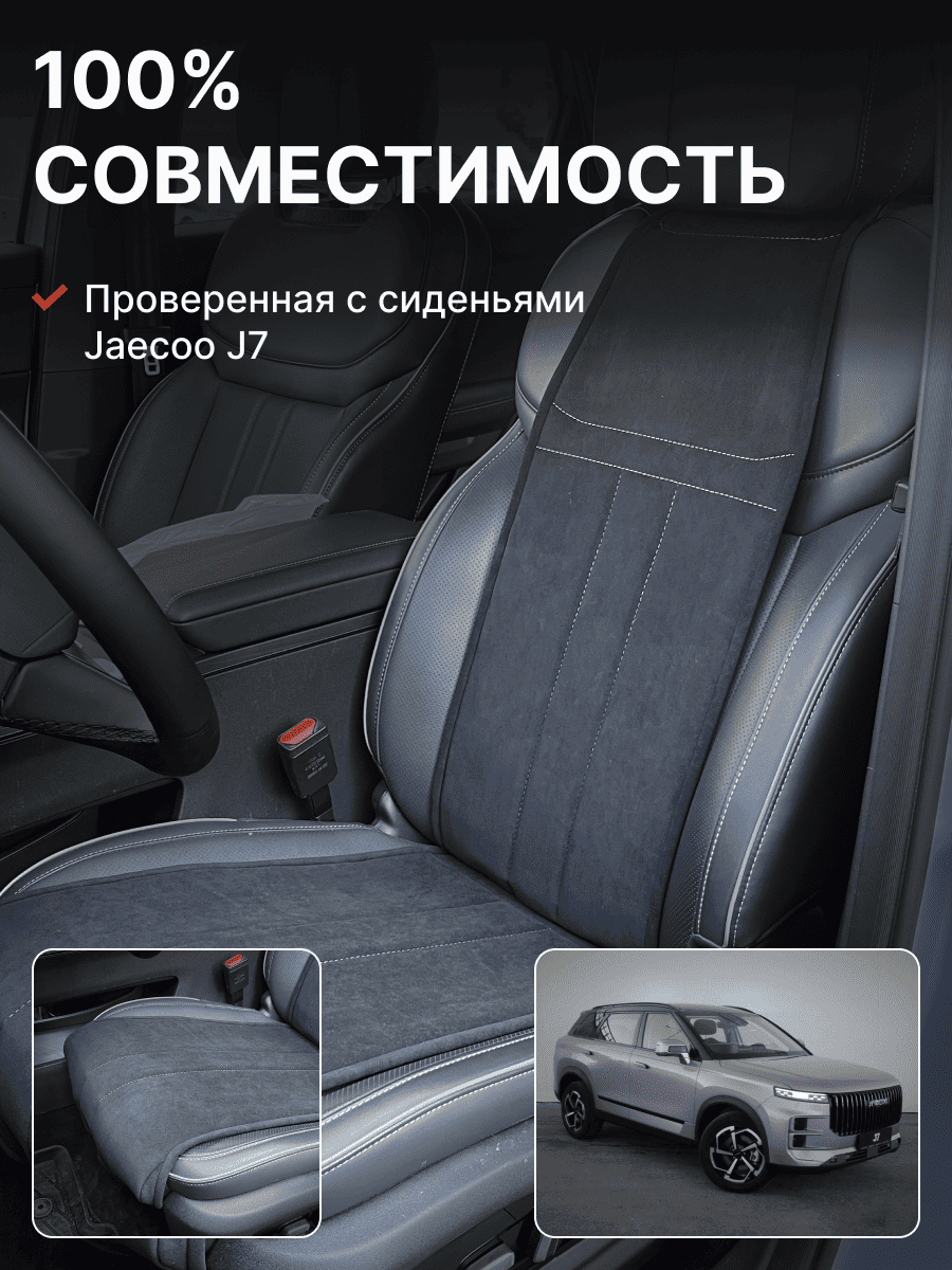 Совместимость: подходит для Jaecoo J7. Материал: микровелюр — мягкий, приятный на ощупь, легко чистится, не выгорает. Назначение: защита оригинальной обивки от загрязнений, износа, повреждений. Комфорт зимой и летом. Крепление: надежная фиксация без смещений, простая установка без инструментов. Безопасность: не мешает срабатыванию боковых подушек безопасности (Airbag). Дизайн: современный внешний вид, улучшает интерьер салона. Уход: легко чистится влажной салфеткой или пылесосом.