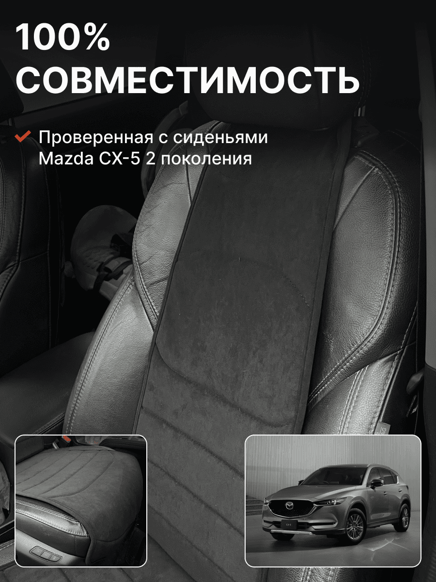 Совместимость: подходит для Mazda CX-5 (2 поколение). Материал: микровелюр — мягкий, приятный на ощупь, легко чистится, не выгорает. Назначение: защита оригинальной обивки от загрязнений, износа, повреждений. Комфорт зимой и летом. Крепление: надежная фиксация без смещений, простая установка без инструментов. Безопасность: не мешает срабатыванию боковых подушек безопасности (Airbag). Дизайн: современный внешний вид, улучшает интерьер салона. Уход: легко чистится влажной салфеткой или пылесосом.