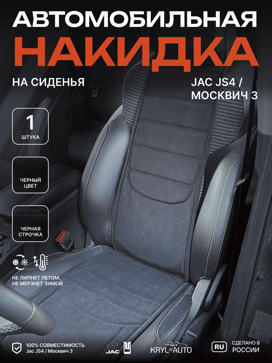 Совместимость: подходит для Jac JS4 / Москвич 3. Материал: микровелюр — мягкий, приятный на ощупь, легко чистится, не выгорает. Назначение: защита оригинальной обивки от загрязнений, износа, повреждений. Комфорт зимой и летом. Крепление: надежная фиксация без смещений, простая установка без инструментов. Безопасность: не мешает срабатыванию боковых подушек безопасности (Airbag). Дизайн: современный внешний вид, улучшает интерьер салона. Уход: легко чистится влажной салфеткой или пылесосом.