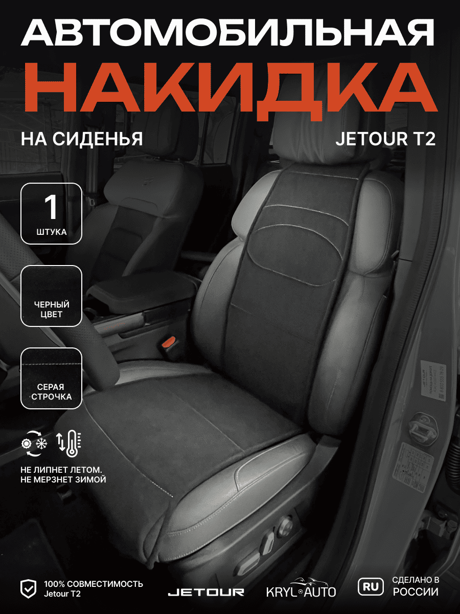 Совместимость: подходит для Jetour T2. Материал: микровелюр — мягкий, приятный на ощупь, легко чистится, не выгорает. Назначение: защита оригинальной обивки от загрязнений, износа, повреждений. Комфорт зимой и летом. Крепление: надежная фиксация без смещений, простая установка без инструментов. Безопасность: не мешает срабатыванию боковых подушек безопасности (Airbag). Дизайн: современный внешний вид, улучшает интерьер салона. Уход: легко чистится влажной салфеткой или пылесосом.